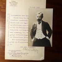 1873-1930, österr. Kabarettist (zeitw. "Überbrettl") - 1. Pfo., auf Rückseite e. "Das Lachen ist das Allerbest,/ Schon seit Adams Tagen gwest.", U. und D. 12.2.1910, Kopierstift. 2. E. Zitat (von Liliencron), U., München 1913, auf Rücks. einer postal. Postkarte, Altersspuren. 3. Brief mit e. Zusatz, U., (Berlin) 17.6.1916, 1 S. gr. 8°, Briefkopf, Altersspuren. An den Schriftsteller Adolf Kohut (1847-1917): ...habe ich mir die Geschichten von Gregor von Csiky aus der Kgl. Bibliothek schon beschaffen können...