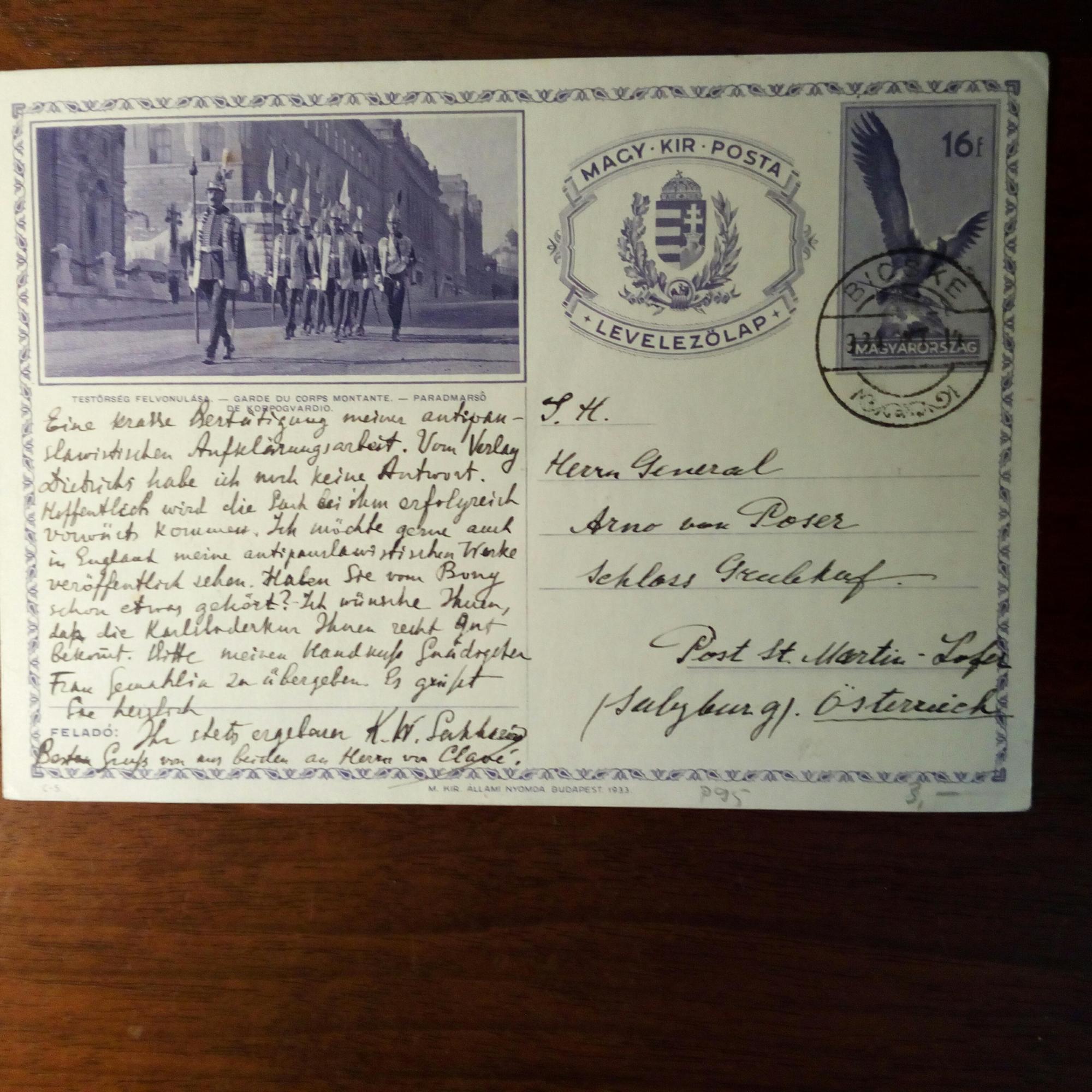 1881-1941, russ. General und Publizist - E. längerer Zusatz und U. auf e. postal. Postkarte mit U. seiner Gattin, (Ungarn) 13.10.1934, sehr kl. Schrift. An Gen.major Arno von Poser (1869 1940) auf Schloss Grubhof (bei Salzburg): ...Wir dachten sehr an Sie beide und an Radio, als wir hier die Nachrichten über die neue Ausgabe von Sarajewo erfuhren. Eine krasse Bestätigung meiner antipanslawistischen Aufklärungsarbeit...