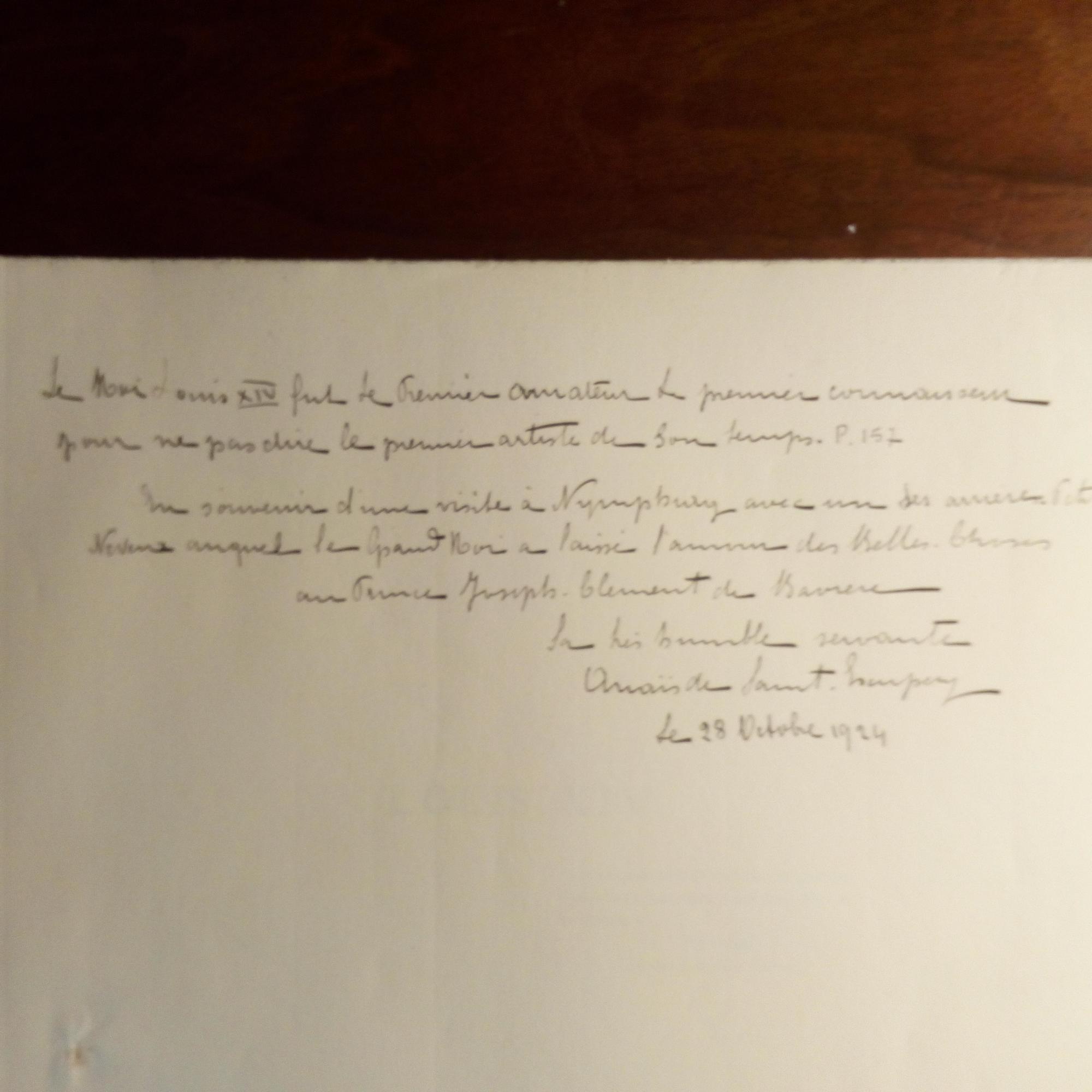 1896-1947, frz. Benediktinerin ("S?ur Bénédicte") u. Kunsthistorikerin - E. Zitat ("Le Roi Louis XIV. fut le premier amateur le premier connaissant pour ne pas dire le premier artiste de son temps...") und Widm. mit U. und D. für Joseph Clemens von Bayern (1902-90, Sohn von Prinz Alfons) anlässl. ihres Besuches auf Schloss Nymphenburg am 28.10.1924, auf Vorsatz des Bandes "Louis XIV." von Louis Bertrand, Paris, Librairie Plon, 1924 (mit Lichtdruck-Tafeln), unbeschn.