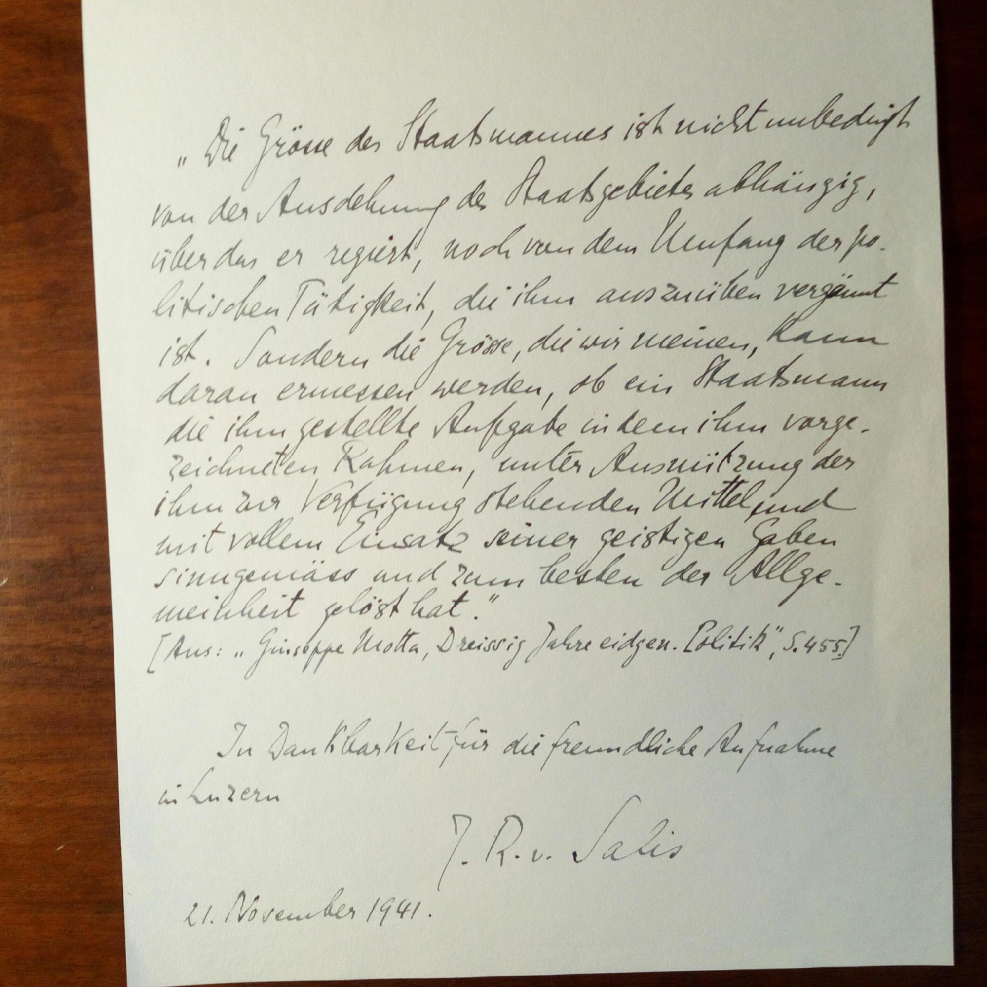 1901-97, schweiz. Historiker - 4°-Blatt m. langem e. Zitat ("Aus: 'Guiseppe Motta, Dreissig Jahre eidgen. Politik', S.455"), e. Anmerkung, U. u. D. 21.11.1941. Beiliegt Kärtchen m. U. u. D.