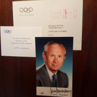 1920-2010, span. Sport-Funktionär - Farb-Pfo. mit U. und Jahr 1988, mit postal. Umschlag und Ded.karte. Als Präs. des IOK. Alles mit Klammerspur.