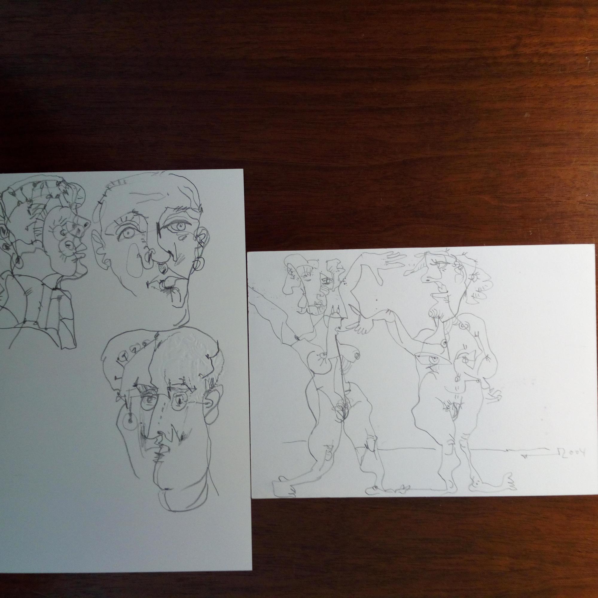 1929-2015, Maler und Zeichner, Präs. der AdK Hamburg - Karte mit e. Bleistift-Zeichnung (Paar, signiert) als e. postal. Postkarte (Hamburg 15.6.2004, an einen Sammler). Weitere U. im Abs. Unter diesem weitere e. kl. Zeichnung. Beiliegt: gedr. Einladung zu den "Préludes CV" von John Neumeier am 13.6.2004 im Foyer der Hamburg. Staatsoper mit U. Auf Rückseite e. Zeichnung (drei Kopf-Skizzen). 160,-
