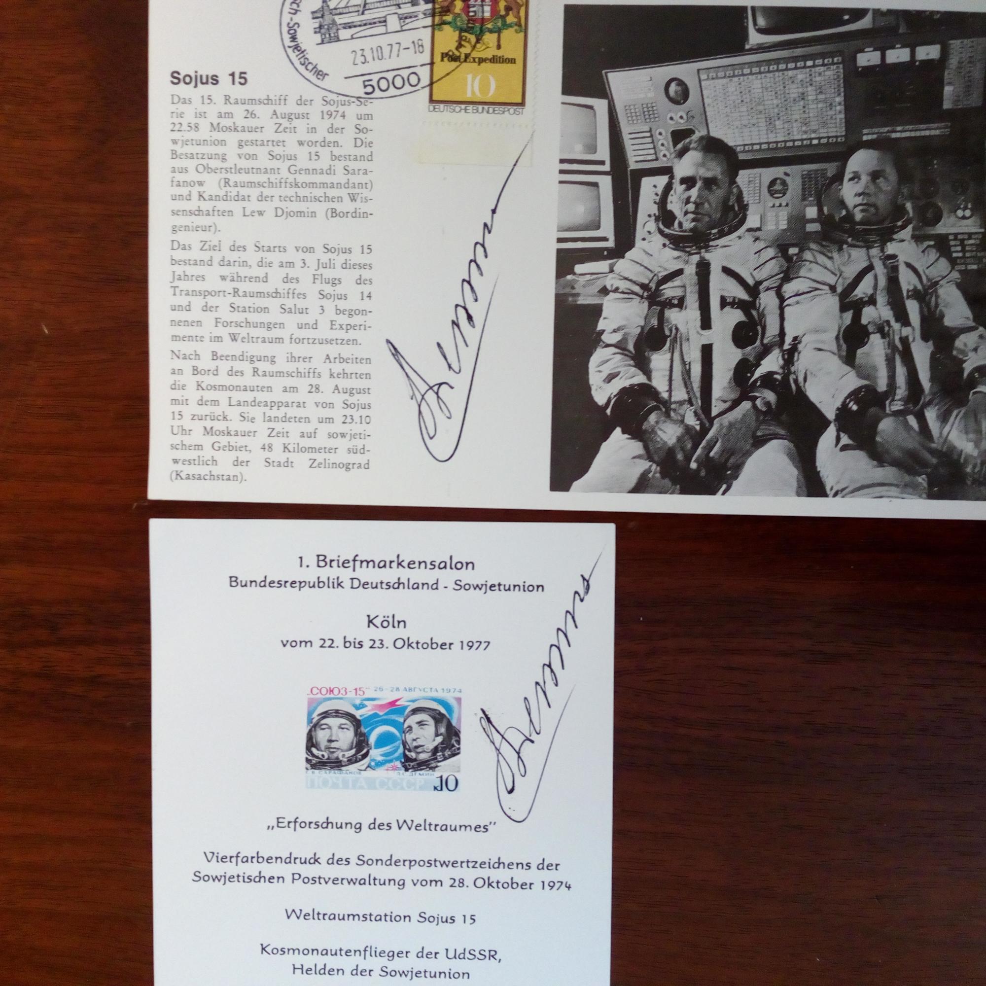 1942-2005, russ. Kosmonaut - Gedenkblatt eines Briefmarkensalons Köln 1977 mit Abb. einer Porträt-Sondermarke, mit U. Dazu Gedenkblatt zur "Sojus 15"-Mission mit Foto, Briefmarke mit Sonderstempel 23.10.1977 und U.