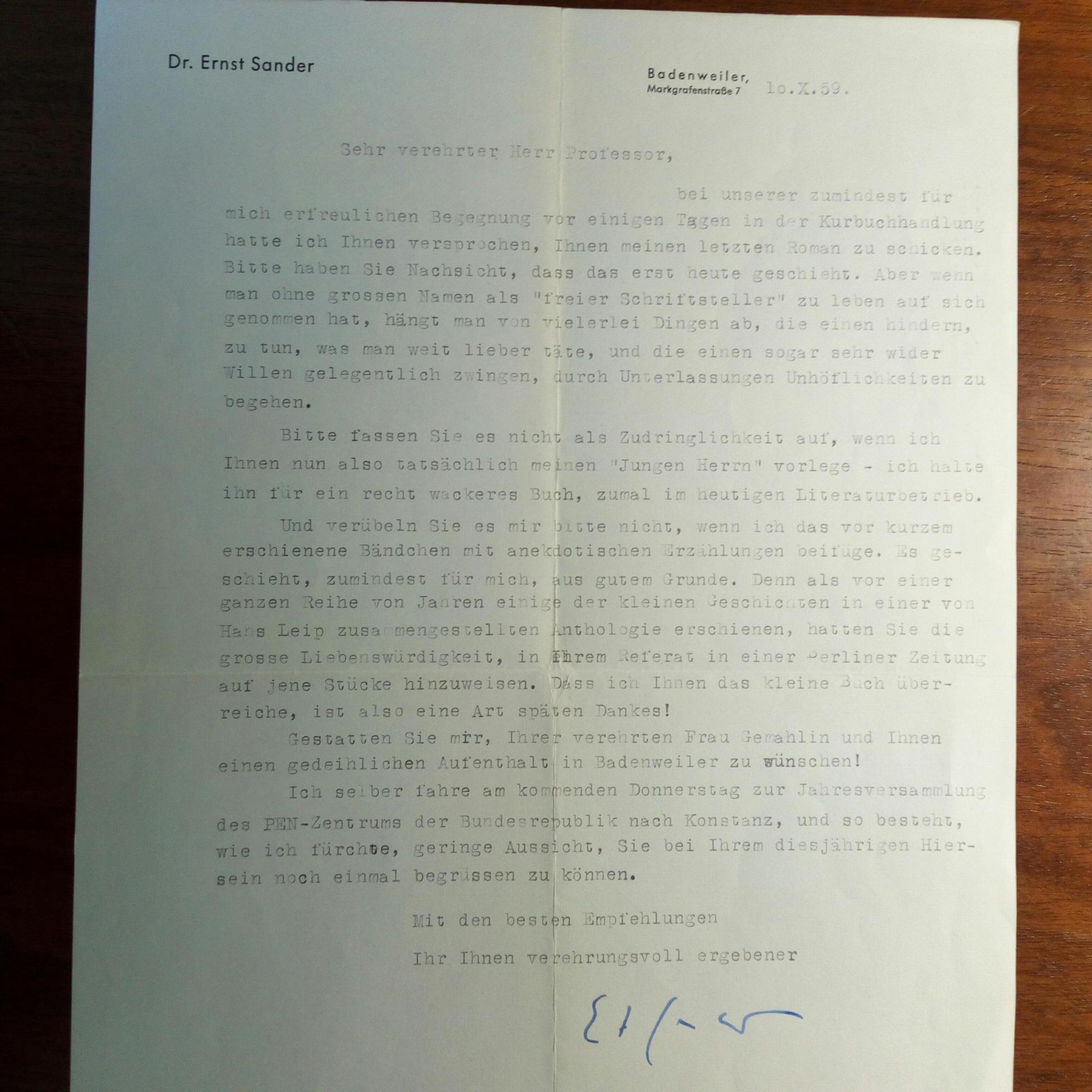 1898-1976, Schriftsteller und Übersetzer - Brief mit U., (Badenweiler) 10.10.1959, ¾ S. 4°, Briefkopf. An einen Professor, den er auf seiner Kur dort kennengelernt hatte. Schickt sein Buch "Der junge Herr" und legt ein "Bändchen mit anekdotischen Erzählungen" bei. ...als vor einer ganzen Reihe von Jahren einige der kleinen Geschichten in einer von Hans Leip zusammengestellten Anthologie erschienen, hatten Sie die grosse Liebenswürdigkeit, in Ihrem Referat in einer Berliner Zeitung auf diese Stücke hinzuweisen...