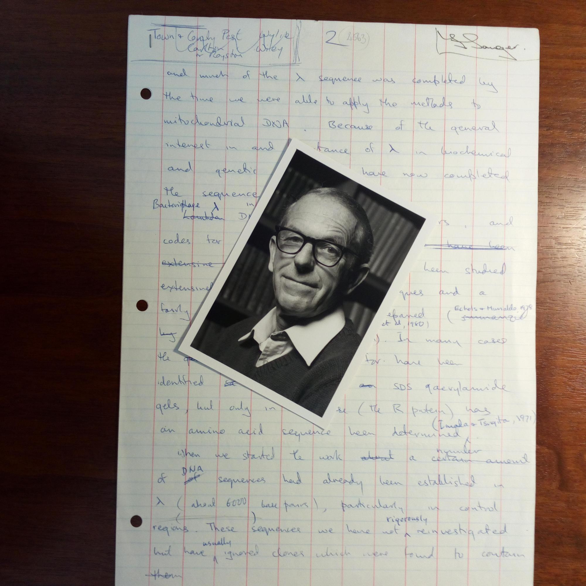 1918-2013, brit. Biochemiker, zweimaliger Nobel-preisträger - Teil eines e. Manuskriptes (ca. ½ S. 4°, über eine DNA-Sequenz), am Kopf signiert. Dazu kl. Pfo. m. E. u. U. auf Rückseite.