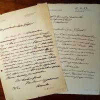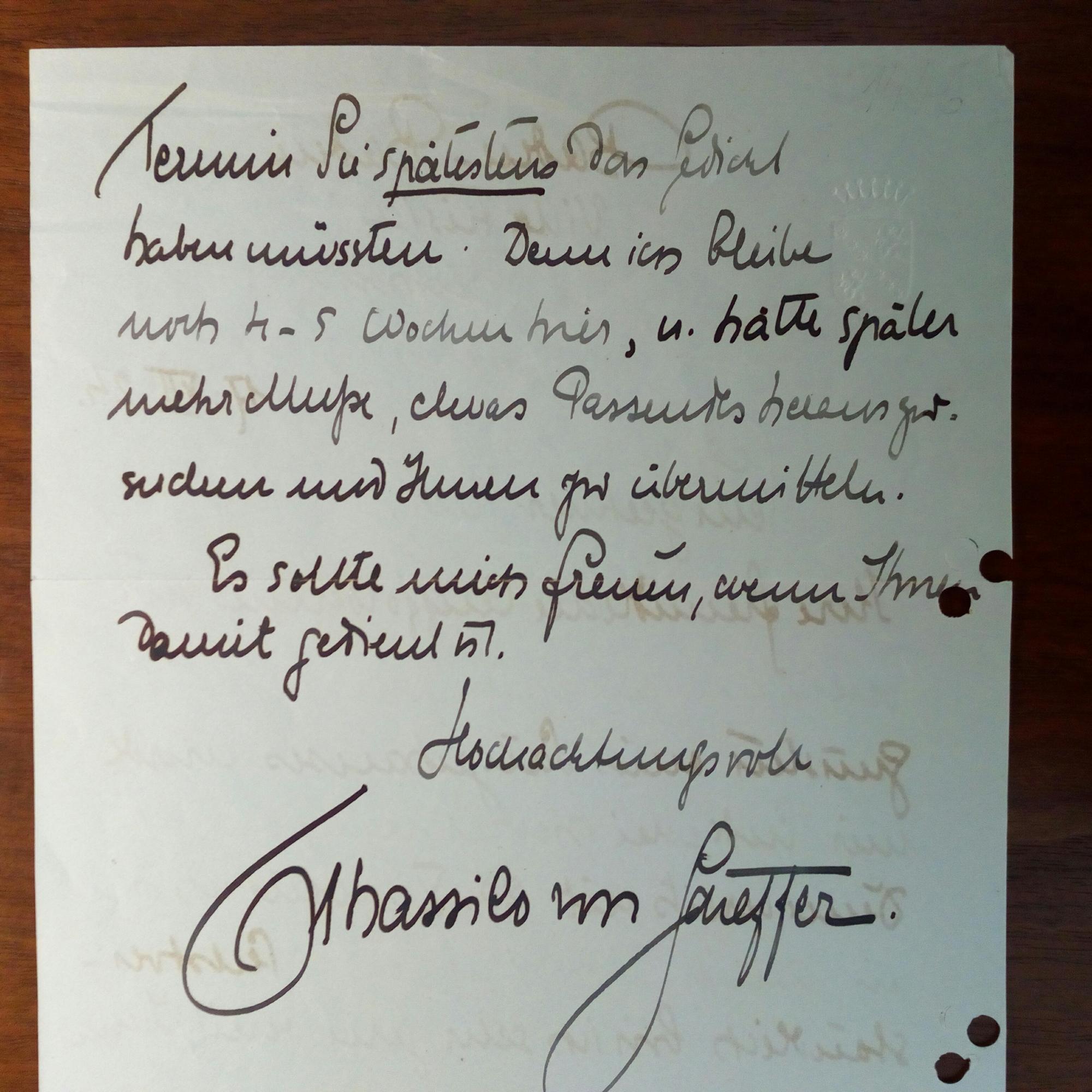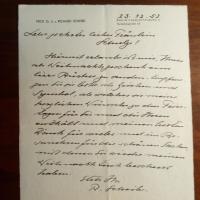 1873-1951, Dichter und Übersetzer antiker griech. Literatur - E. Brief mit U., Baden-Baden , Villa Frisia 17.7.1924, 1 ½ S. kl. 4°, ähnl. e. Brief mit U., 13.10.1924, 1 ½ S. 4°, re. Rand ger. beschn., und e. postal. Postkarte 18.10.1924. Alle an Pfändler in Baden- Baden. betr. Gedichten für die "Anthologie zu Gunsten eines Sängerhauses". Sendet 4 zur Auswahl, besteht aber darauf, Korrektur zu lesen: ...Ohne das, veröffentliche ich nie ein Gedicht, weil es mir künstlerisch auf jedes Komma ankommt... Dazu Typoskript seines Gedichtes "Ikaros", 1 S. 4°, gelocht. Beiliegt e. Brief mit U., Berlin (Abs.stempel) 17.7.1943, 2 S. 8°quer, gepr. Wappen am Kopf, Klammerspur. An Buchhandl. Wenner in Osnabrück: Lehnt die Anfrage nach einer Lesung aus Gesundh.gründen ab.