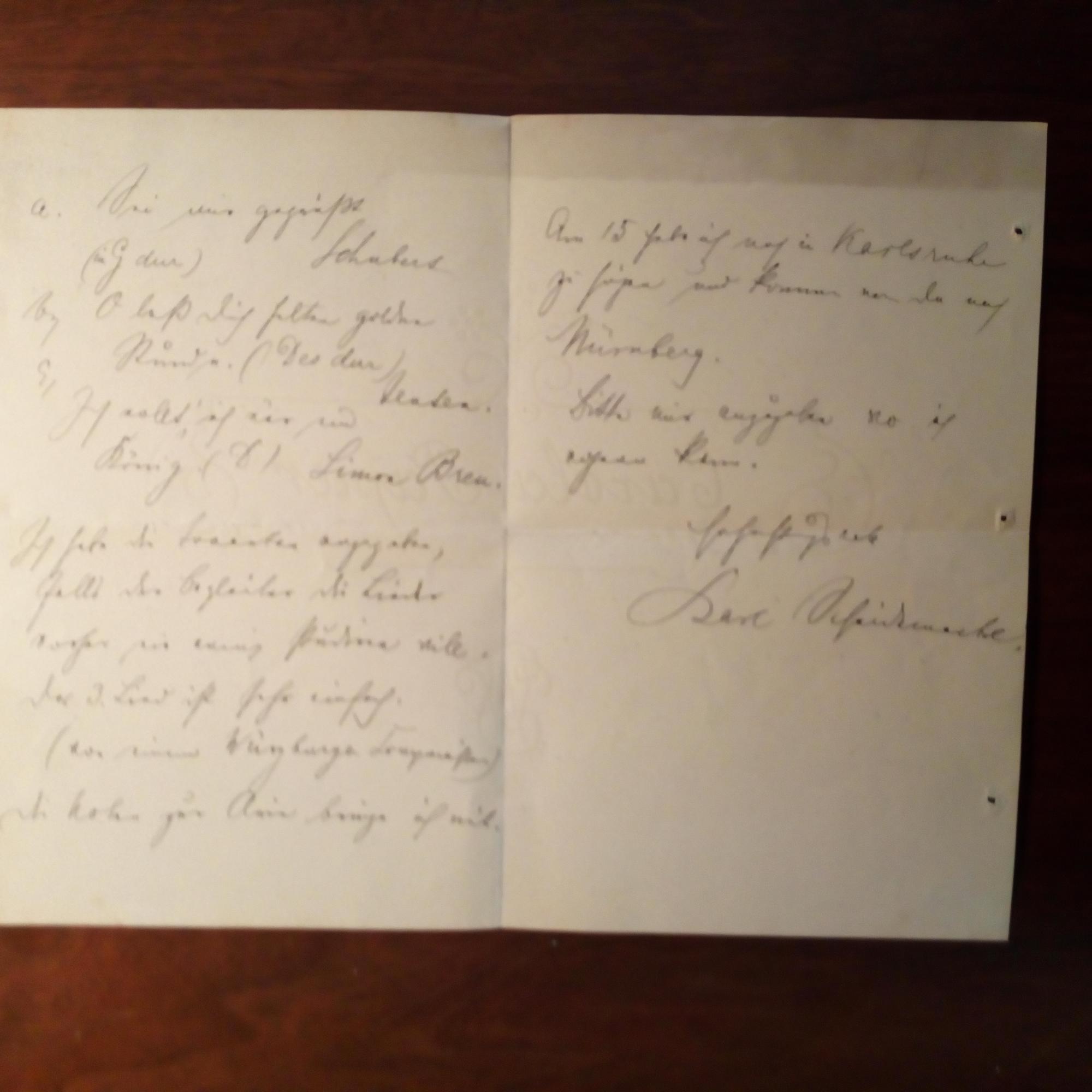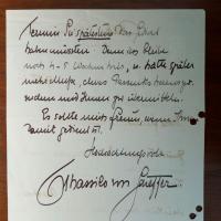 1859-1923, Sänger (Bariton) und Operndir. - E. Brief mit U., Dresden 23.8.1890, 2 ½ S. 8°, kl. Gebr.spuren. Stellt sein Programm für einen Liederabend vor (Schubert, Marschner und Simon Breu). Nennt als Preis für den Abend 400,- Mark.