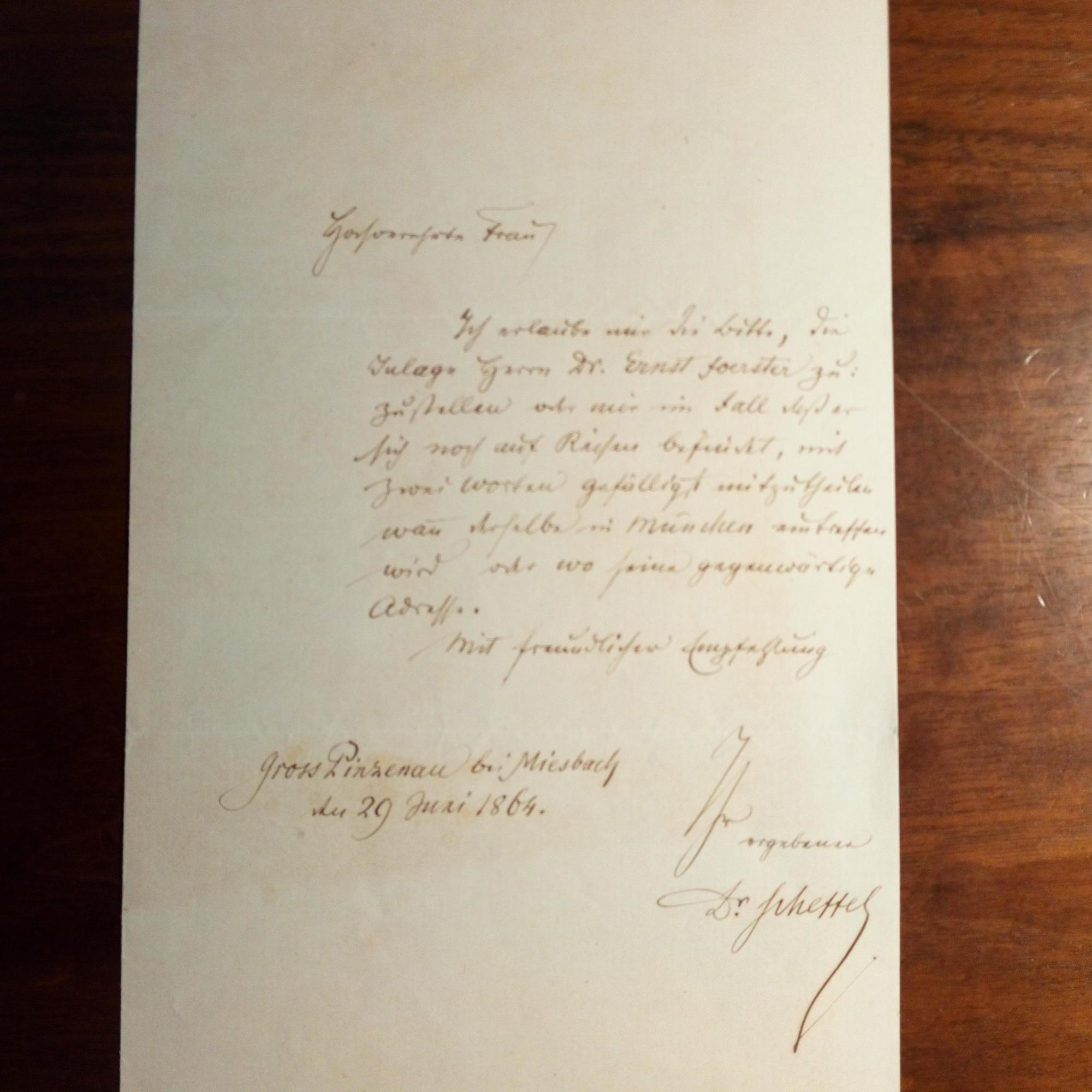 1826-86, Dichter und Schriftsteller, Schöpfer des Wortes "Biedermeier" - 3 Autographen, teilw. mit kl. Alters-spuren: 1. E. Brief mit U., Pinzenau (bei Miesbach) 29.6.1864, 1 S. gr. 8°. An eine Dame: ...die Inlage Herrn Dr. Ernst Foerster (1800-85, Maler und Kunsthistoriker in München) zuzustellen oder mir im Fall, dass er sich noch auf Reisen befindet, mit zwei Worten gefälligst mitzutheilen... 2. E. Mitt. mit U., Karlsruhe 4.7.1870, auf gedr. Einladung des "Polytechnischen Vereins" in Karlsruhe (Studentenverbindung, Dir. Chr. Wiese) zum "Fest Commers", zus. 1 S. 8°. ...durch eine morgen anzutretende Reise verhindert... 3. E. postal. Postkarte mit U., Karlsruhe 27.12.1877, ger. Altersspuren. An den Hrsg. der "Badischen Schulzeitung", Adolf Meuser in Mannheim: ...Wenn Sie den Verfasser des Gedichtes "Der Turner" ermittelt haben, so berichtigen Sie gefälligst die Angabe...daß es von mir verfasst sei...