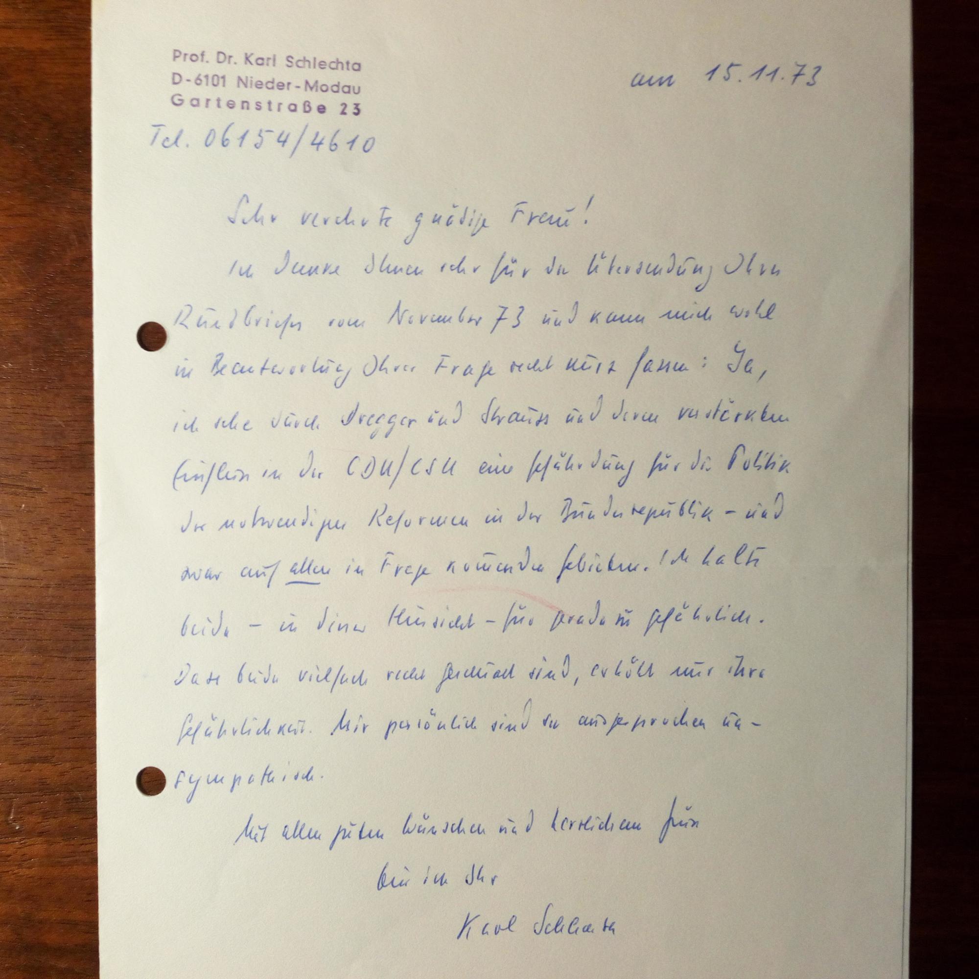 1904-85, österr.-dt. Philosoph, Nietzsche-Forscher - E. Brief mit U., (Nieder-Modau bei Darmstadt) 5.11.1973, 1 S. 8°. An die Schriftstellerin Angelika Mechtel (1943-2000), damals Pressesprecherin der "Demokratischen Aktion" in München: ...Ja, ich sehe durch Dregger und Strauß und deren verstärkten Einfluss in der CDU/CSU eine Gefährdung für die Politik...Dass beide vielfach recht gescheid sind, erhöht nur ihre Gefährlichkeit. Mir persönlich sind sie ausgesprochen unsympathisch...