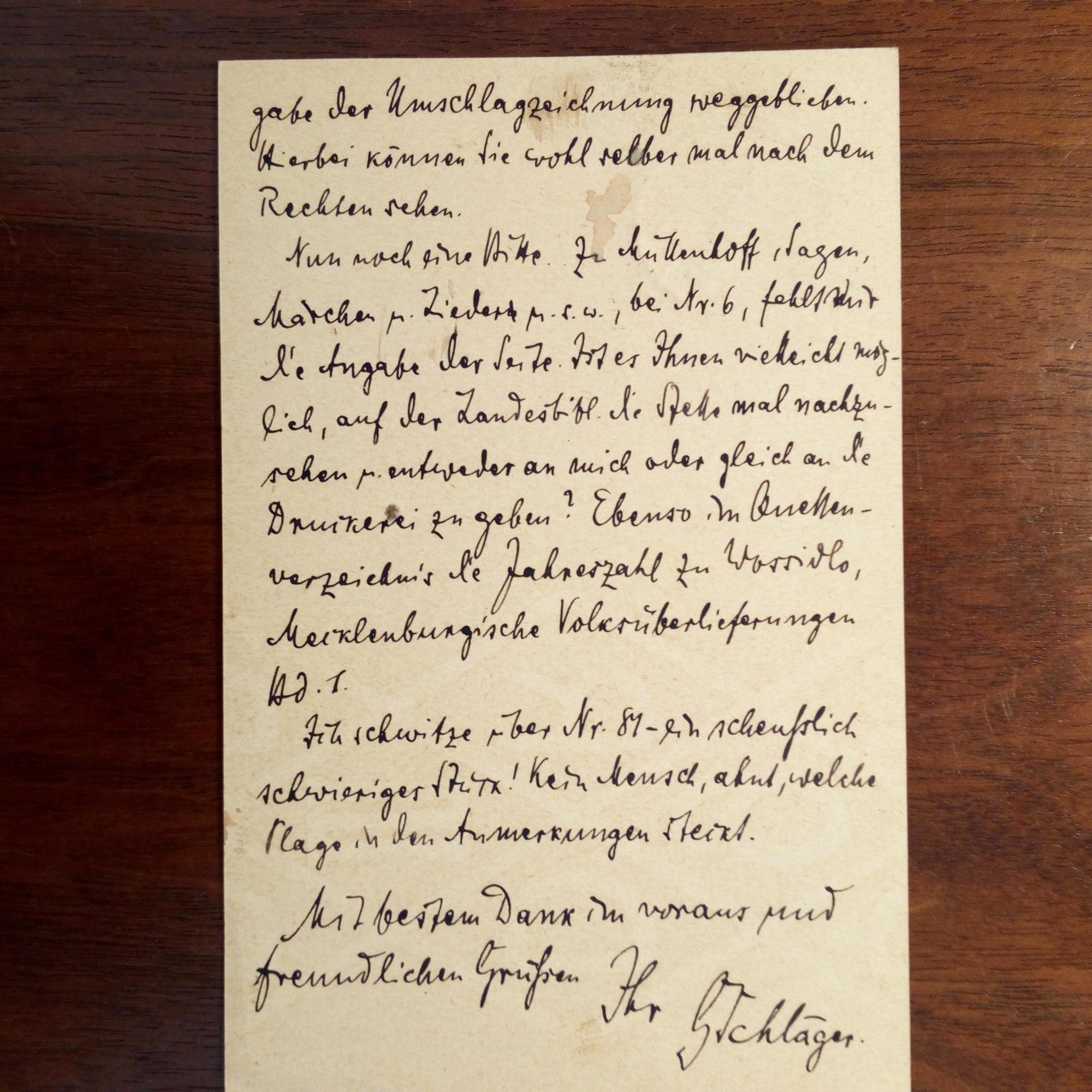 1870-1921, Romanist und Volkslied-Forscher - E. postal. Postkarte mit U., (Eschwege 20.11.1919). An den Volkslied-Forscher Johann Lewald (1862-1935) in Kassel mit Korrekturangaben: ...Ich schwitze über Nr. 87- ein scheußlich schwieriger Murx! Kein Mensch ahnt, welche Plage in den Anmerkungen steckt... Dazu e. postal. Ansichtskarte (Freiburg) mit U., Freiburg 19.11.1916, an dens.: bedankt sich für ein Buch, kann jedoch kein Gegengeschenk machen, ...hoffe aber sehr, daß ich Sie dort in meinem letzten hessischen Vierteljahr einmal zu sehen bekomme...