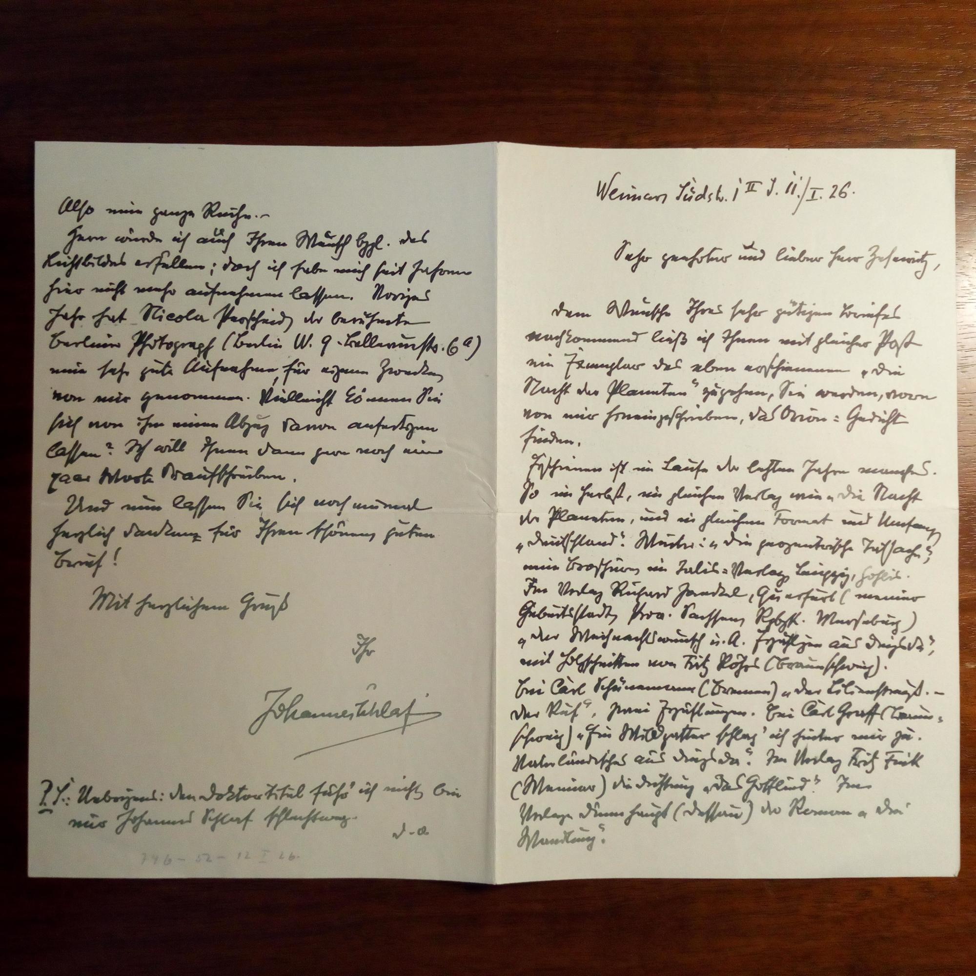 1862-1941, Schriftst. - E. Br. m. U., Weimar 14.3.1922, 2 ½ S. gr.8°, kl. u. dicht geschr. An den Bibliothekar und Karl May-Forscher Hans Zesewitz (1888-1976) in Hohenstein: ...Vielleicht machen Sie im Anschluß an meine religiös-philosophischen ... auch auf meine geozen-trische Feststellung aufmerksam... Mit vielem Details zu seinen Werken.