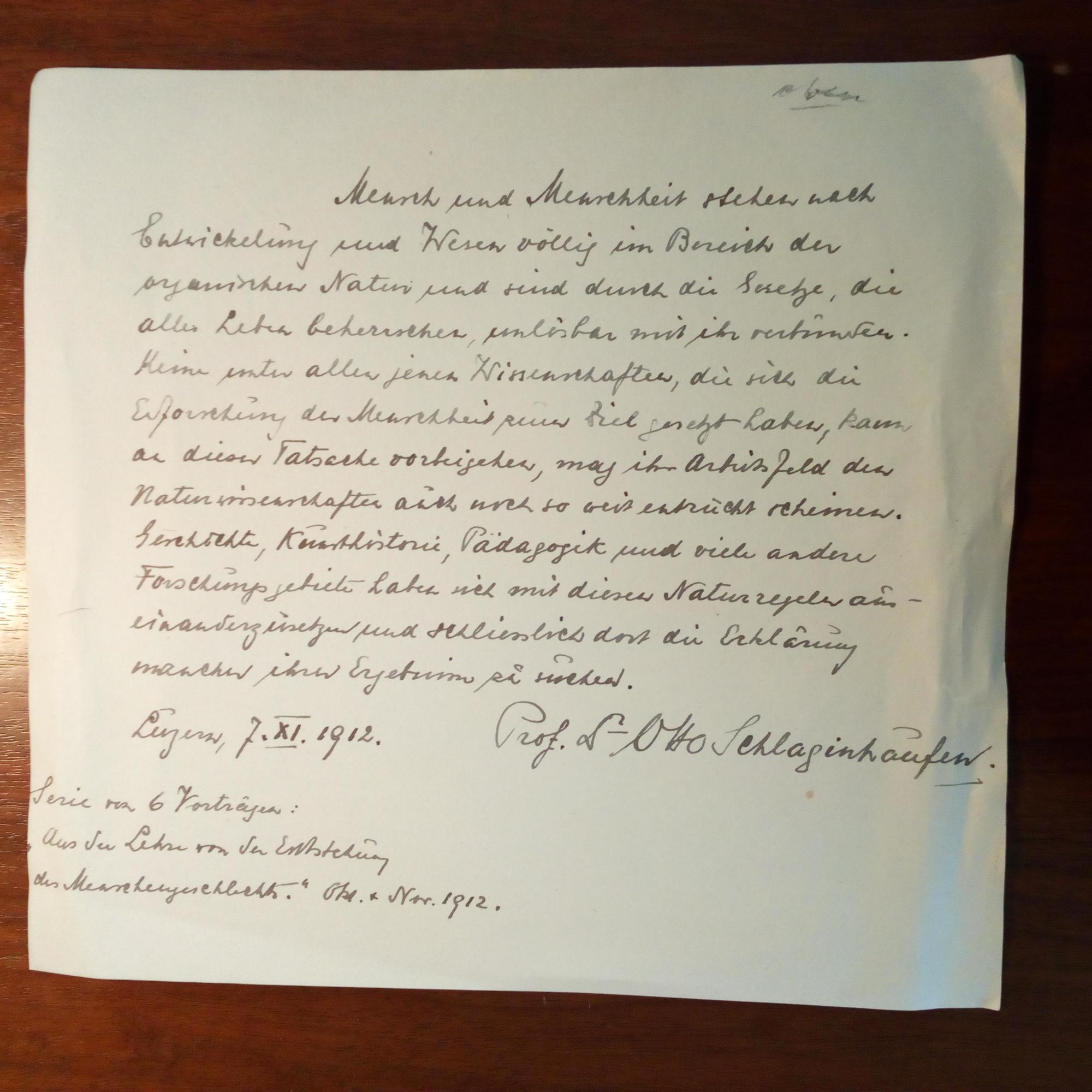 1879-1973, schweiz. Anthropologe, Leiter des Zwinger-Museums in Dresden - Folio-Blatt mit e. langem Zitat ("Aus der Lehre von der Entstehung des Menschengeschlechts. Serie von 6 Vorträgen, gehalten Okt. u. Nov. 1912") mit U., Luzern 7.11.1912, ger. Randschäden.