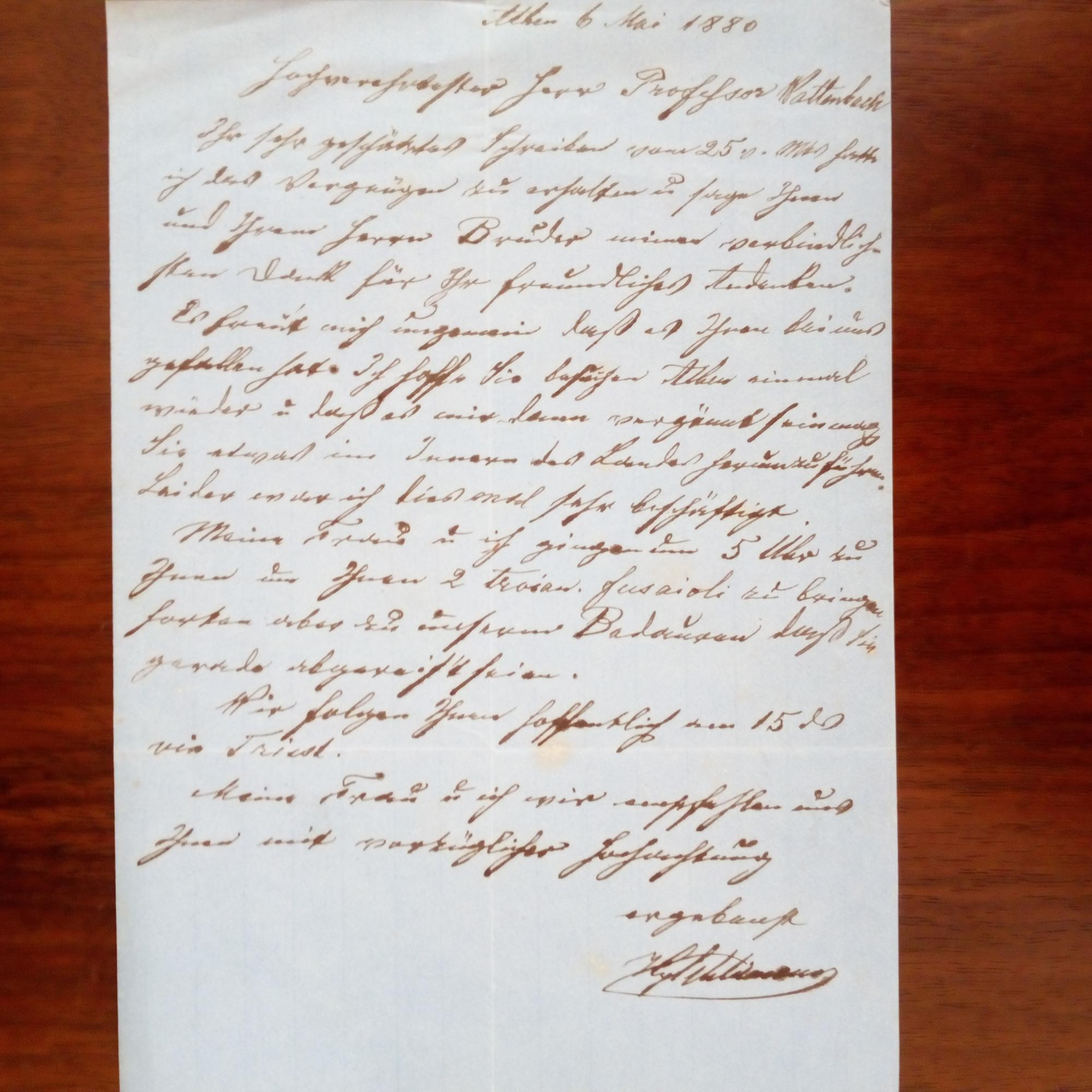 1822-90, Archäologe - E. Brief mit U., Athen 6.5.1880, ¾ S. 8°, blaues Papier, etw. altersfleckig. An den Histor. und Paläographen Wilhelm Wattenbach (1819-97) in Berlin nach dessen Rückkehr: ...hoffe, Sie besuchen Athen einmal wieder u. daß es mir dann vergönnt sein mag Sie etwas im Innern des Landes herumzuführen...