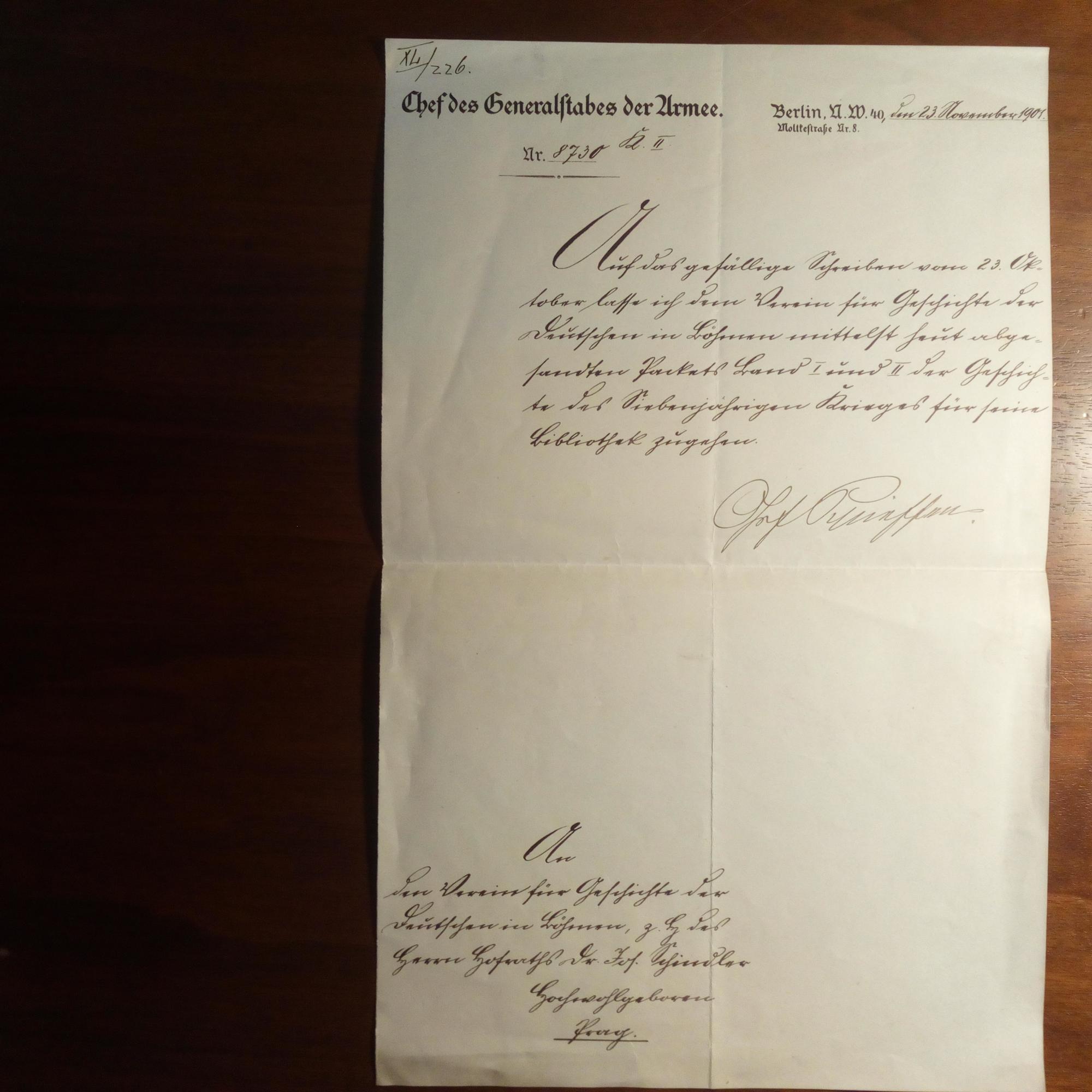 1833-1913, preuß. Generalfeldmarschall - Br. m. U., (Berlin) 23.11.1901, 1 S. folio, Br.kopf als Chef des Gen.stabes, Bearb.nummern, kl. Alterssp. An den Leiter des "Vereins für Geschichte der Deutschen in Böhmen", Josef Schindler (1835-1911, Theologe u. Historiker) in Prag: Sendet für die Bibliothek die eben ersch. "Geschichte des Siebenjährigen Krieges", Bd. I. u. II. (hrsg. vom Gen.stab).
