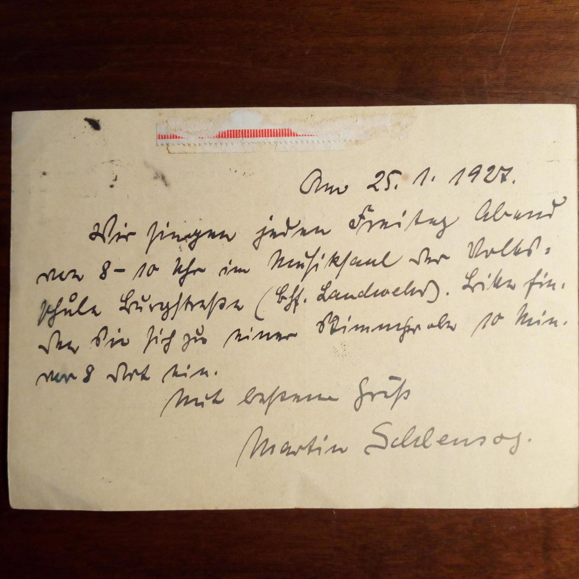 geb. 1897, Lieder-Komponist und Förderer der Jugendmusikbewegung - E. postal. Postkarte m. U., (Hochkamp) 25.1.1927, Abs.stempel, Gebr.spuren. An den evangel. Pastor und Direktor des "Rauhen Hauses" in Hamburg, Martin Hennig (1902-97): ...Wir singen jeden Freitag ... im Musiksaal der Volkshochschule...
