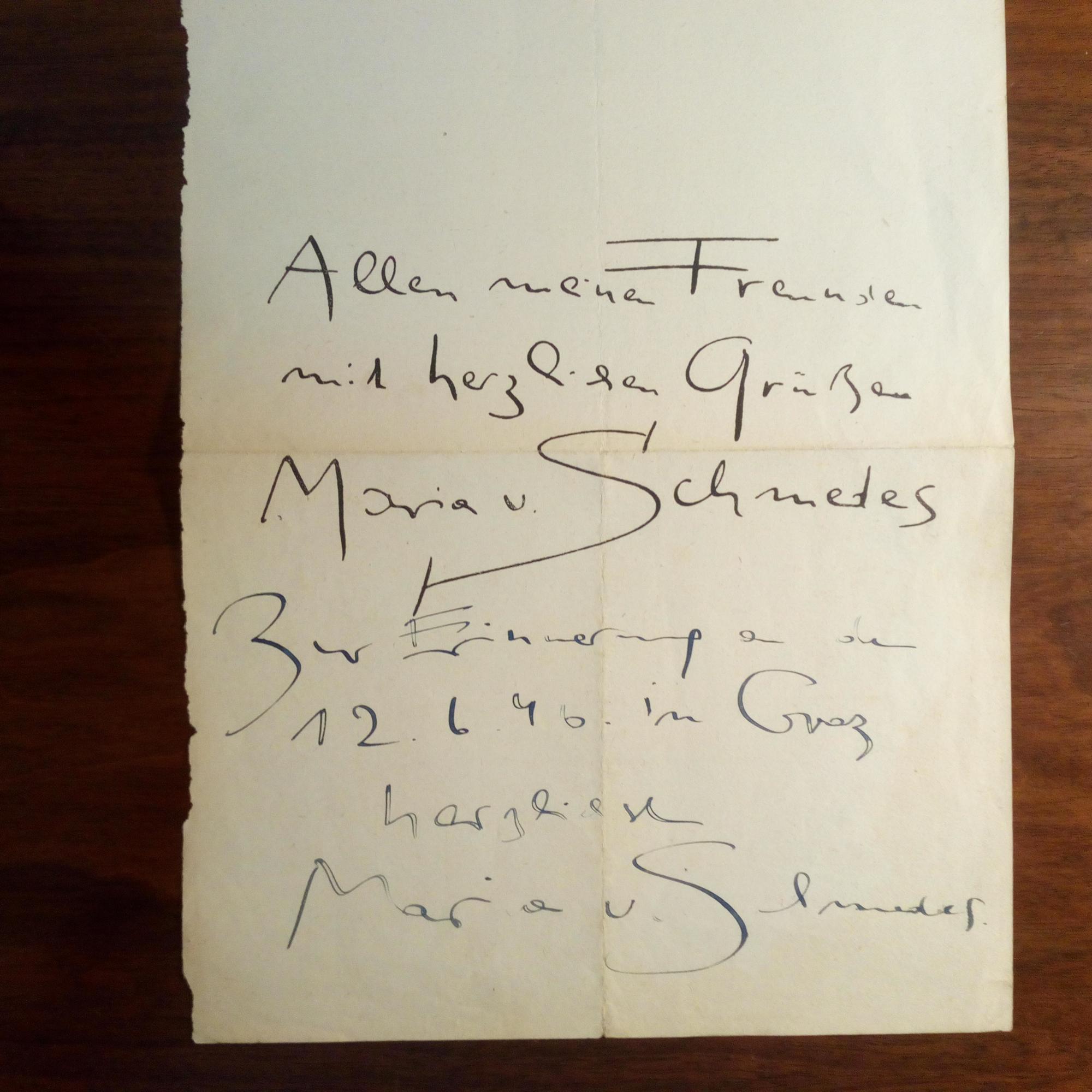 1917-2002, österr. Kabarettistin und Sängerin - 2 Einträge, je m. U., der zweite m. O. u. D. Graz 12.6.1946, auf Rücks. eines ausgerissenen Drucks (Noten und Text) des Liedes "Es geht alles vorüber, es geht alles vorbei...". Kl. Altersspuren.