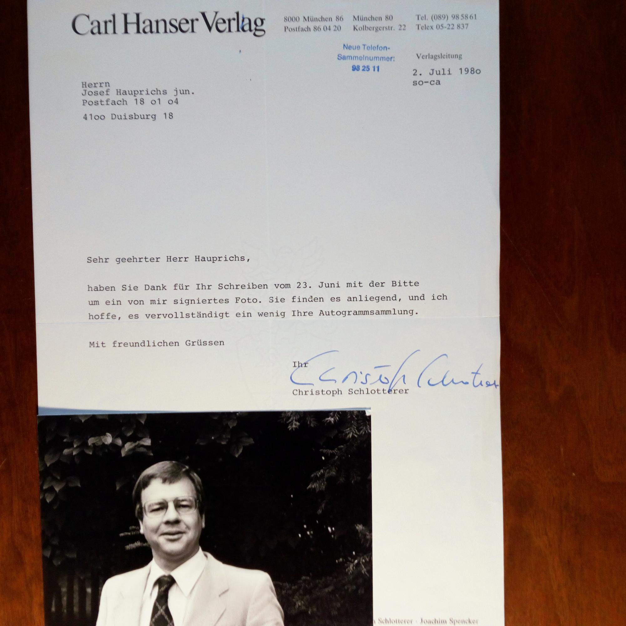 1937-86, Lektor und Verleger - Privates Pfo. (quer) m. U. auf Rückseite. Dazu kurzer Begleitbr. m. U., (München) 2.7.1980, Br.kopf des Hanser-Verlages.