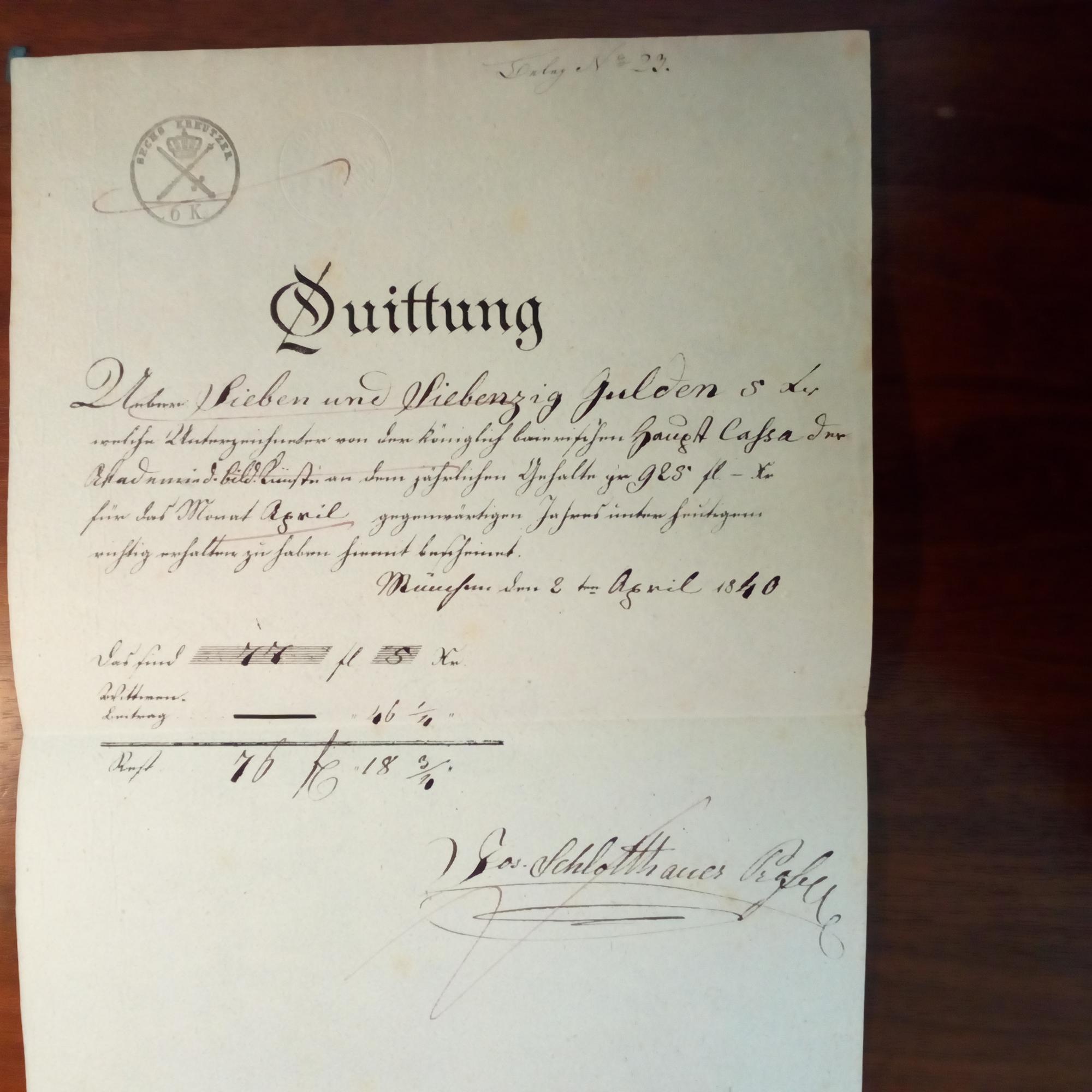 1789-1869, Maler - E. geschr. Urkunde mit U., München 2.4.1840, ¾ S. folio, kl. Stempel und gepr. Siegel, Bearb.vermerke. Quittung für sich über 77 Gulden als Gehalt der Akademie.