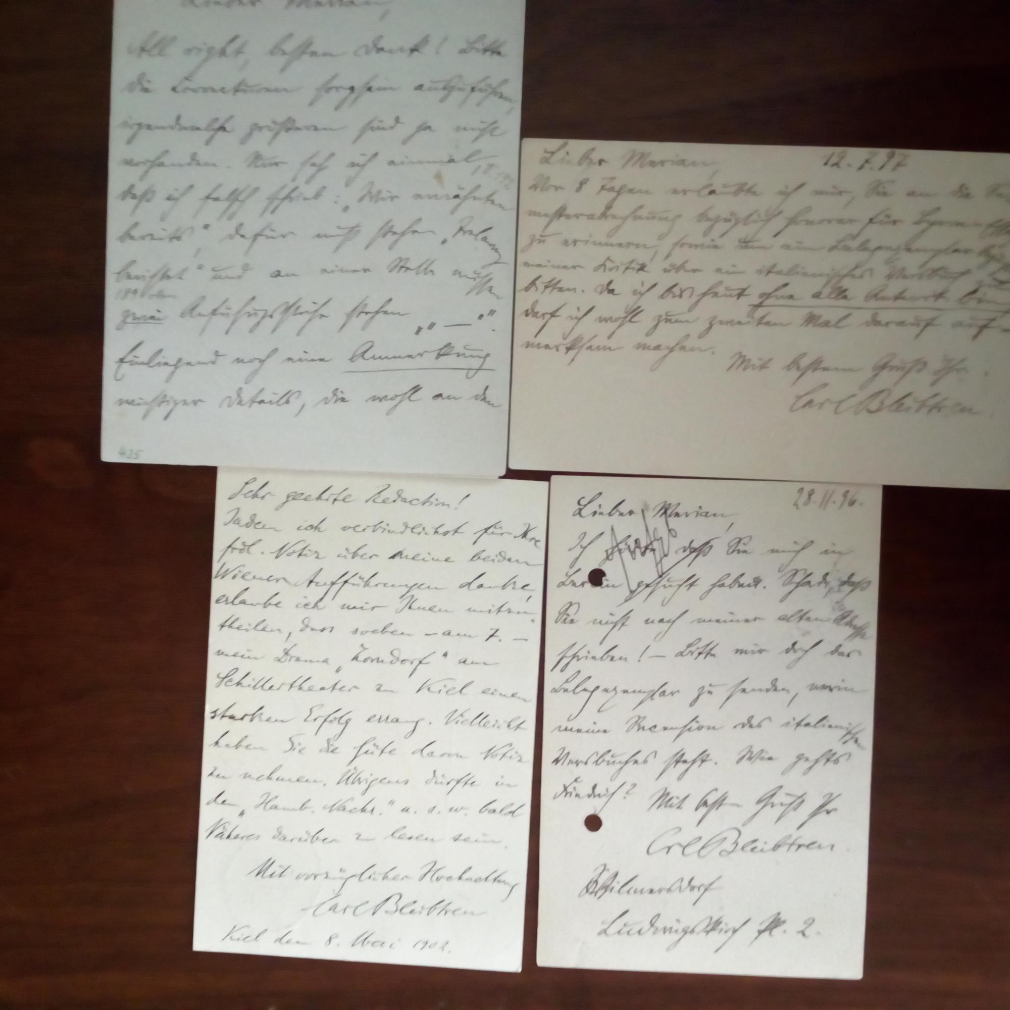 1859-1928, Schriftsteller in Berlin, Bruder des Malers Georg B. - E. Brief mit U., 30.1.1897, 2 S. kl. 8°. An den Redakteur der Zeitschrift "Die Gesellschaft" Hans Merian (1857-1902) in Leipzig: ...vollende soeben ein größeres Opus "Byron der Übermensch", nach welchem man endlich wohl Byron völlig erkennen wird... Dazu 2 e. postal. Postkarten an dens.: 28.11.1896: Bittet um ein Belegexemplar "bezüglich meiner Kritik über ein italienisches Versbuch" und 12.7.1897: Erinnert noch einmal daran und an sein Honorar. Beiliegt: E. postal. Postkarte (1902) mit U. An das Feuilleton der "Münchner Neuesten Nachrichten": Weist auf die erfolgreiche Aufführung seines Stückes "Zorndorf" in Kiel hin. (4 Autographen).