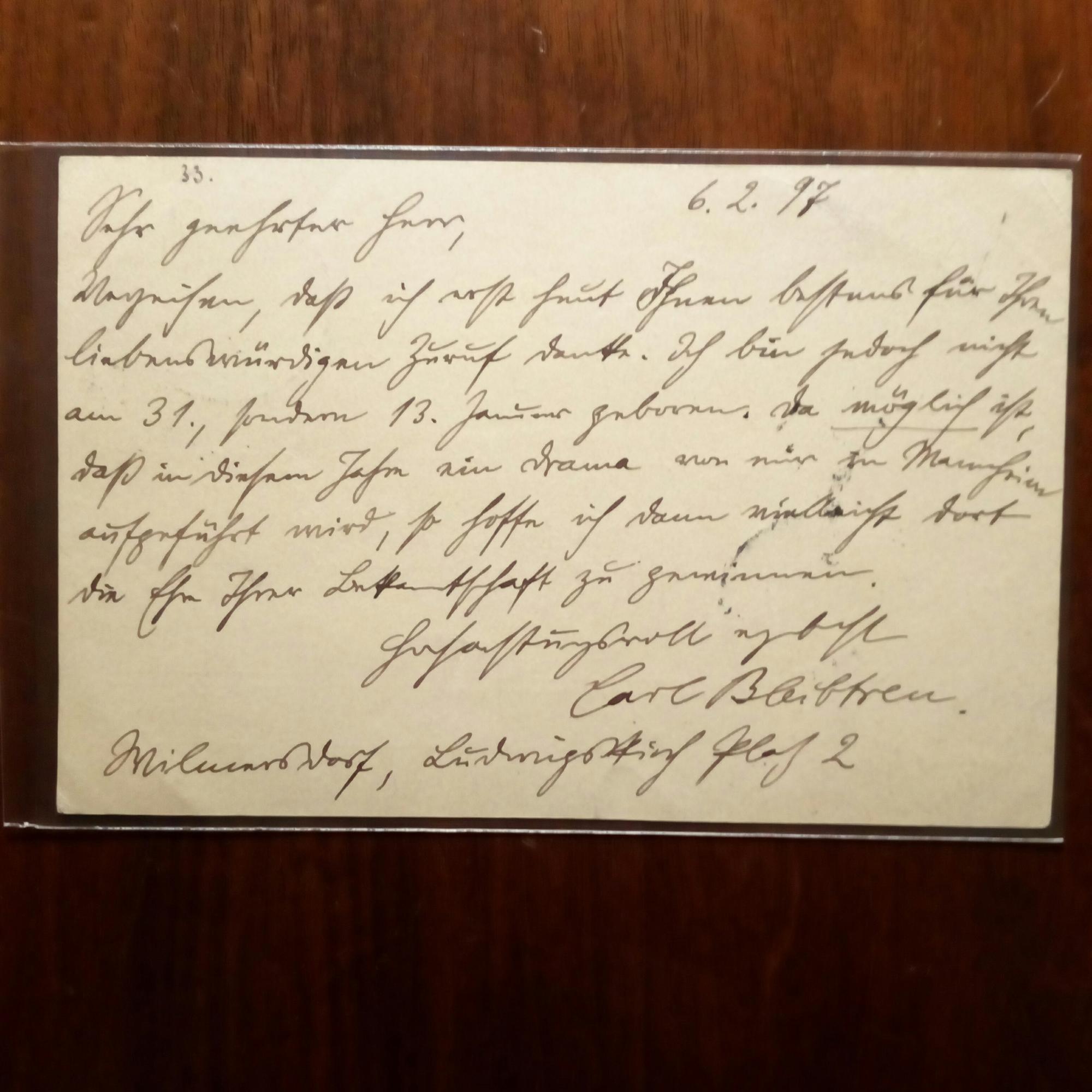 1859-1928, Schriftsteller und Publizist, Sohn des Malers Georg B. - E. postal. Postkarte mit U., Wilmersdorf 6.2.1897. An Rechtsanwalt Franz Meuser in Mannheim: Dankt für "liebenswürdigen Zuruf". ...da möglich ist, daß in diesem Jahre ein Drama von mir in Mannheim aufgeführt wird...