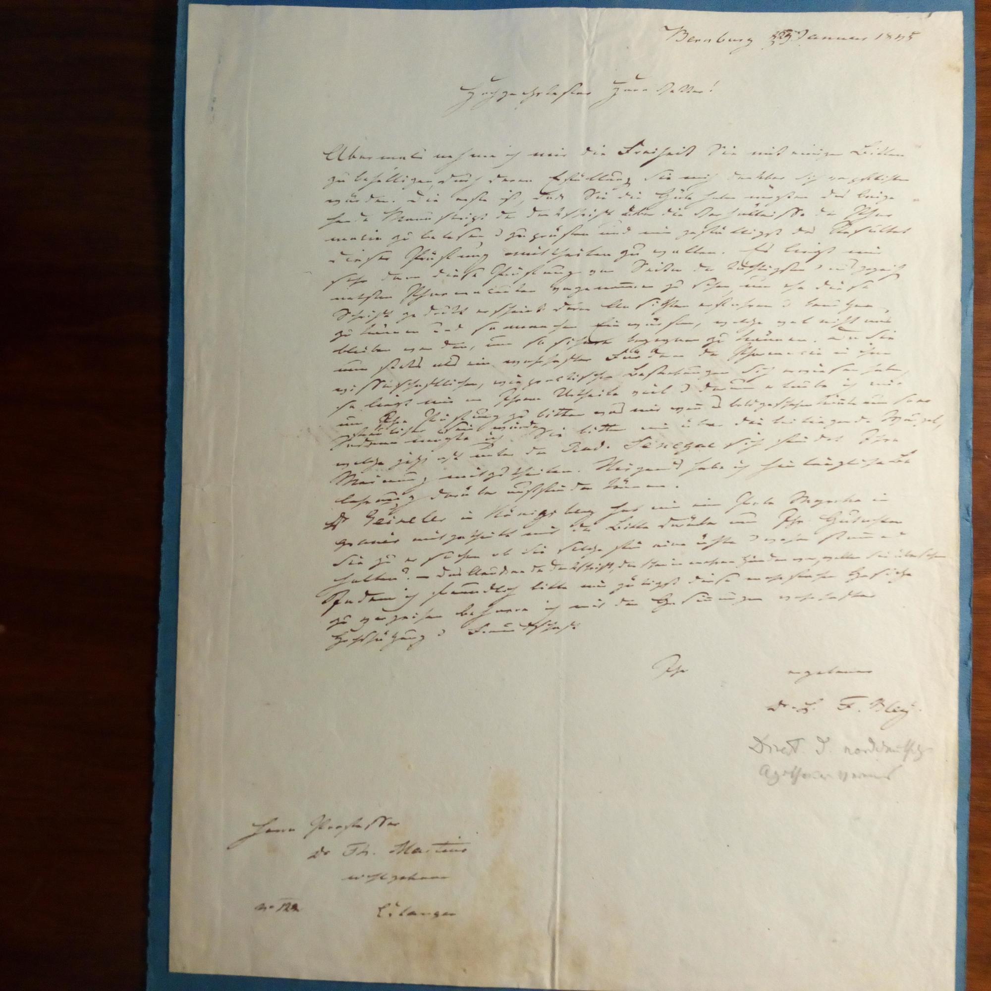 1801-68, Pharmazeut, Pionier des Apotheken-wesens - E. Br. m. U., Bernburg 29.1.1845, 1 S. 4°, sehr kl. Schrift, leichte Altersspuren, am Rücken des unbeschr. 2. Blattes hinterlegt. Bittet Prof. Th. Martini in Erlangen u.a., ein Manuskript zu bearbeiten.