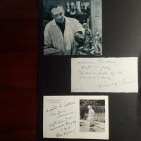 1902-86, schweiz. Bildhauer und Zeichner - Karte m. e. Gedicht (4 Z.), U. u. D. , leicht mont. auf folio. Darauf ebenso Druck-Pfo. (im Atelier) und kl. Klapp-Ansichtskarte mit Brunnenskulptur. Das Ganze ausführl. e. beschriftet m. U. u. D. 4.7.1960.