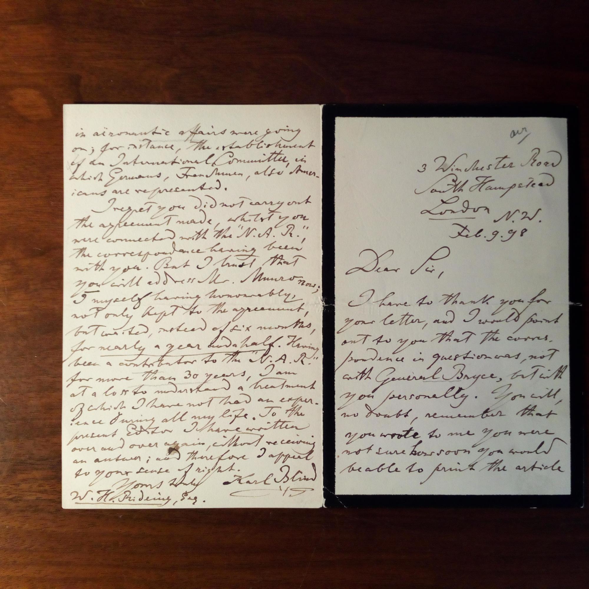 1826-1907, Politiker und Schriftsteller - E. Brief mit U., Greyshott (Hampshire) 13.4.1898, 1 S. 8°, kl. Gebr.spuren. Aus dem Exil in England (weg. Teilnahme an der Bad. Revolution) an den Redakteur der "North American Review" in Boston, den Schriftst. Henry Riding (1853-1918). Bestätigt Scheckeingang für einen Artikel und benötigt 5 Freiexemplare für "friends abroad, occupied with practical aeronautic science".