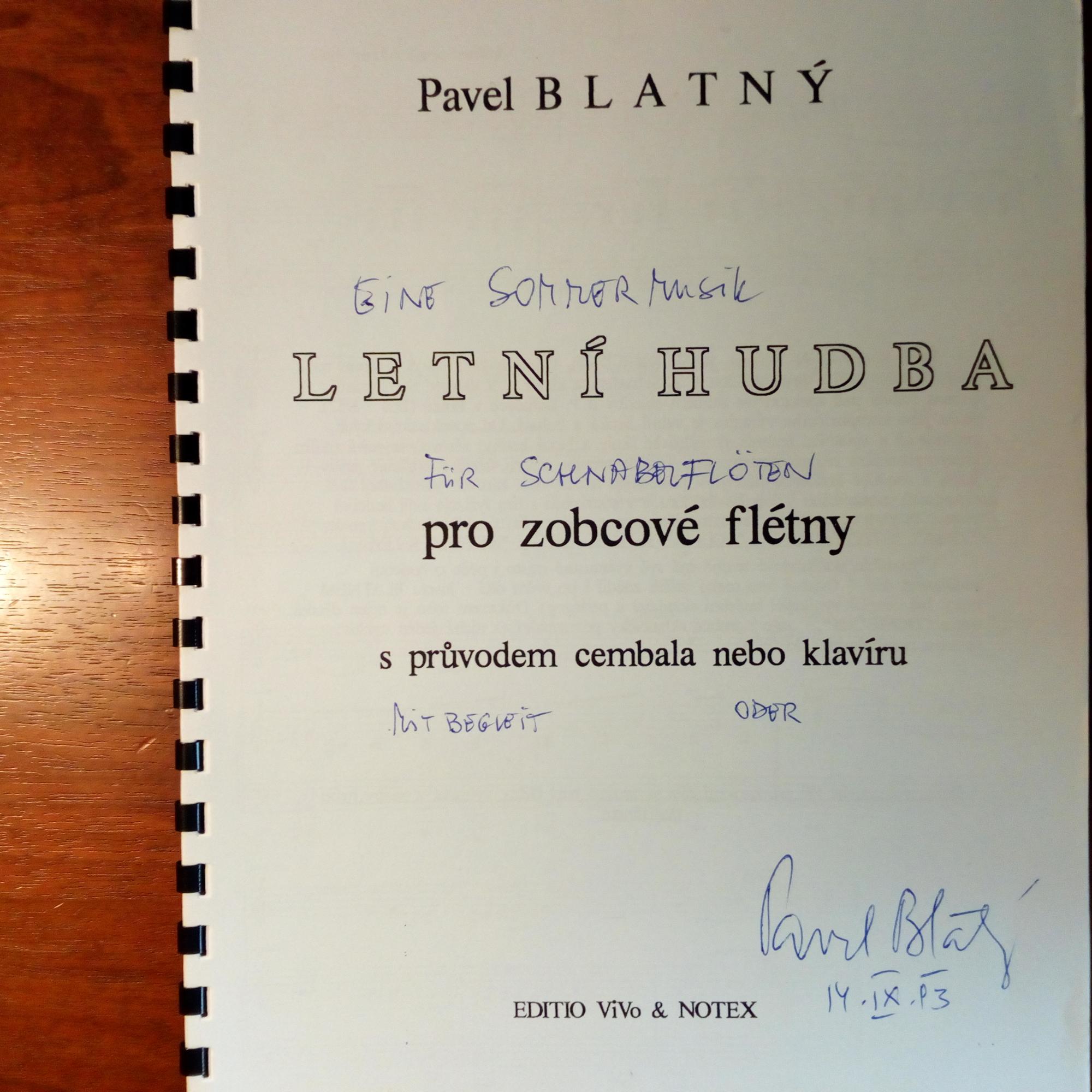 1931-2021, tschech. Komponist - Die gedr. Noten seiner "Sommermusik für Schnabelflöten mit Cembalo oder Klavier" (lt. e. Übersetzung von ihm) mit U. und D. 14.9.1993, auf Vorderseite.