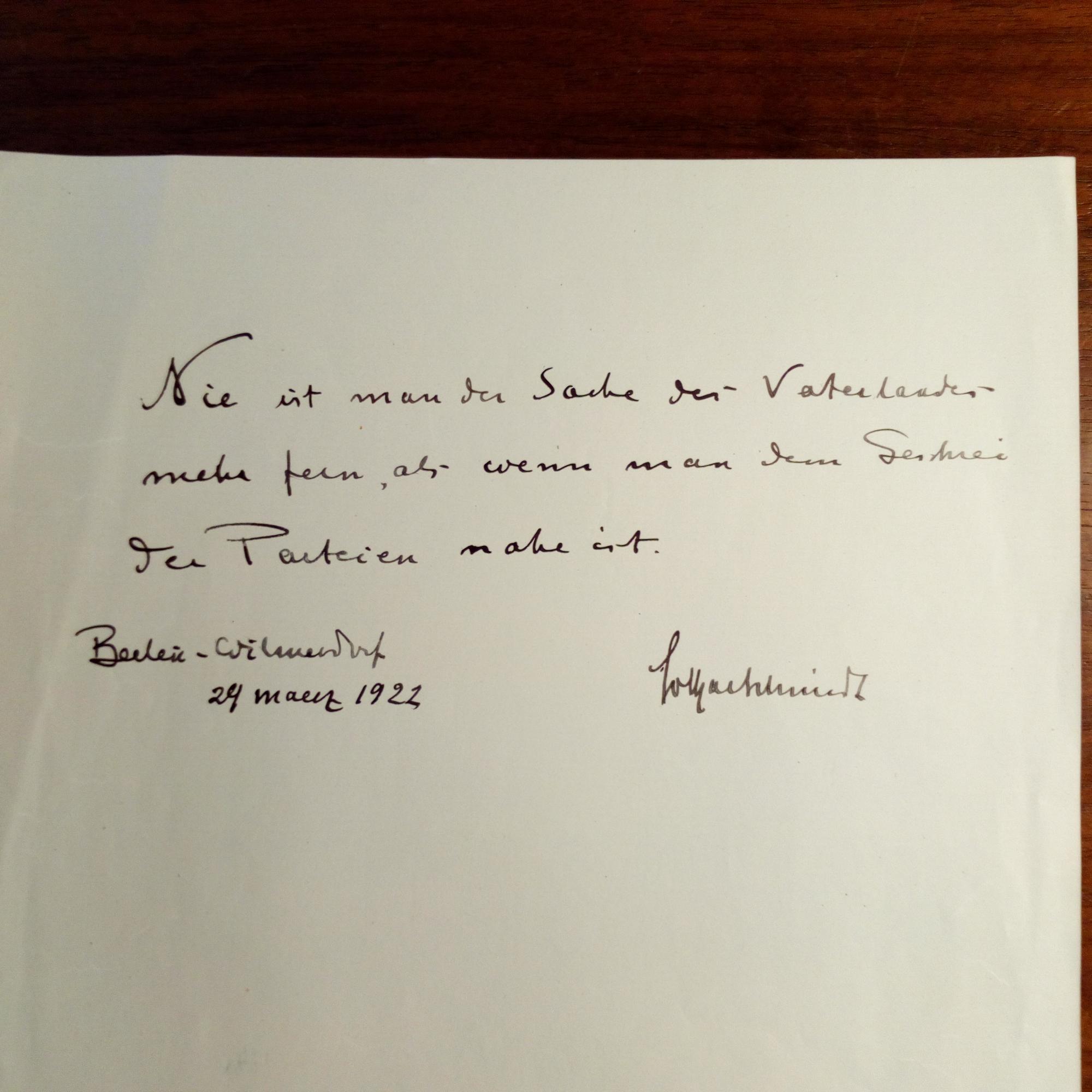 eigtl. Golschmidt, 1862-1931, Schriftsteller - 4°-Blatt mit e. Zitat, Berlin-Wilmersdorf 29.3.1922, ½ S. 4°. "Nie ist man der Sache des Vaterlandes mehr fern, als wenn man den Geschrei der Parteien nahe ist.".