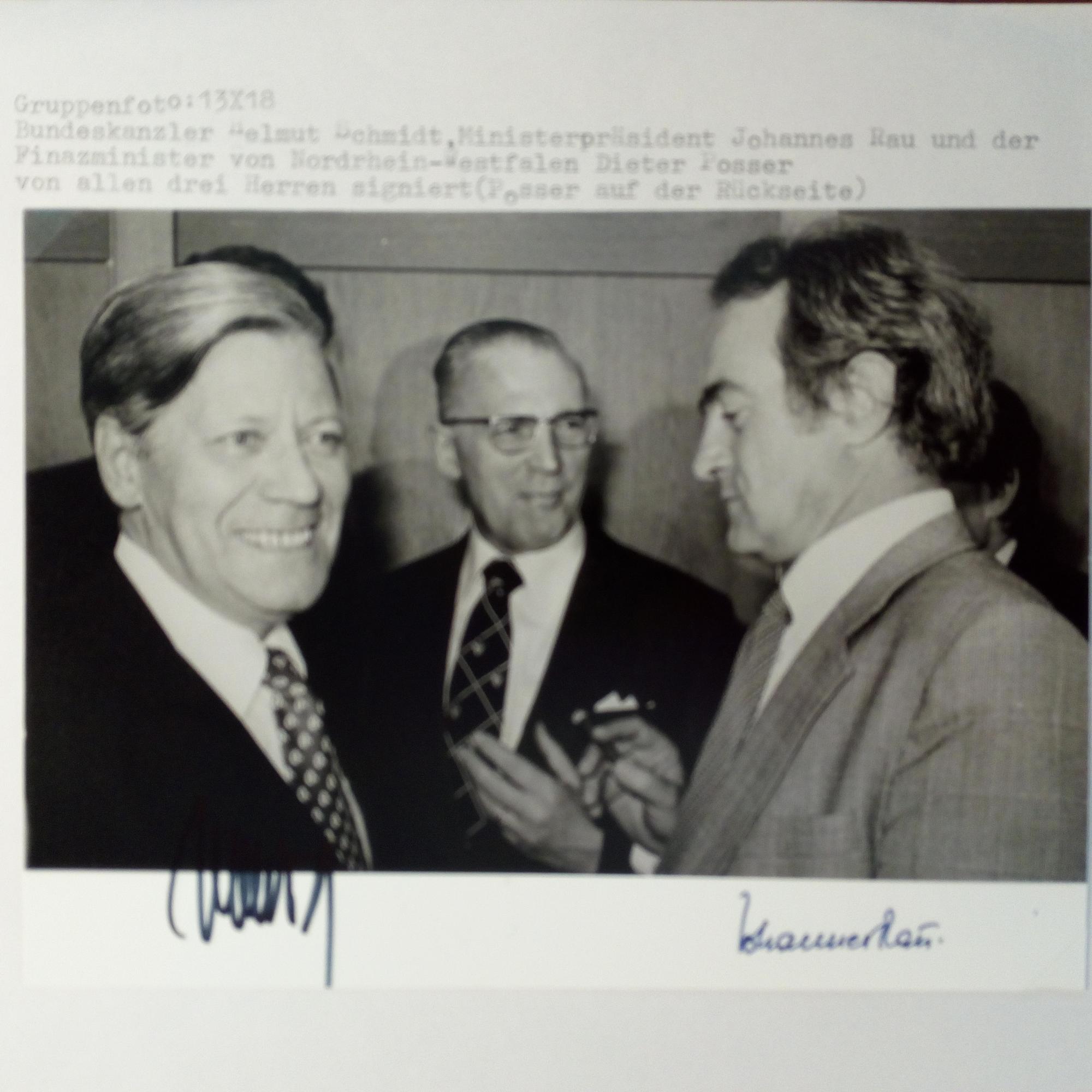 Foto (ca. 8° quer) von Bundeskanzler Helmut Schmidt, dem Minister-präs. von NRW Johannes Rau (später Bundespräsident) und dem Finanz-minister von NRW Diether Posser, m. allen 3 U. (P. auf Rückseite).