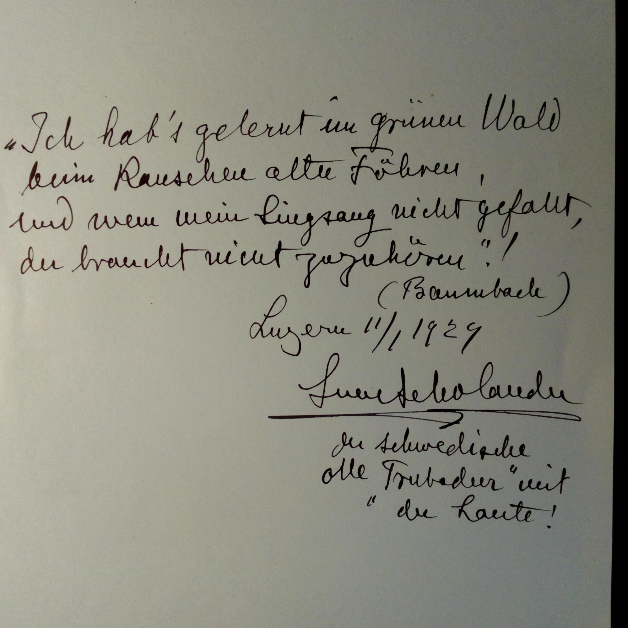 1860-1936, schwed. Sänger u. Komponist zur Laute, Fotograf - E. Zitat (4 Z., von Baumbach) mit U., e. Zusatz "der schwedische 'Troubadour' mit der Laute", Luzern 11.1.1929, ca. ¾ S. 4°.