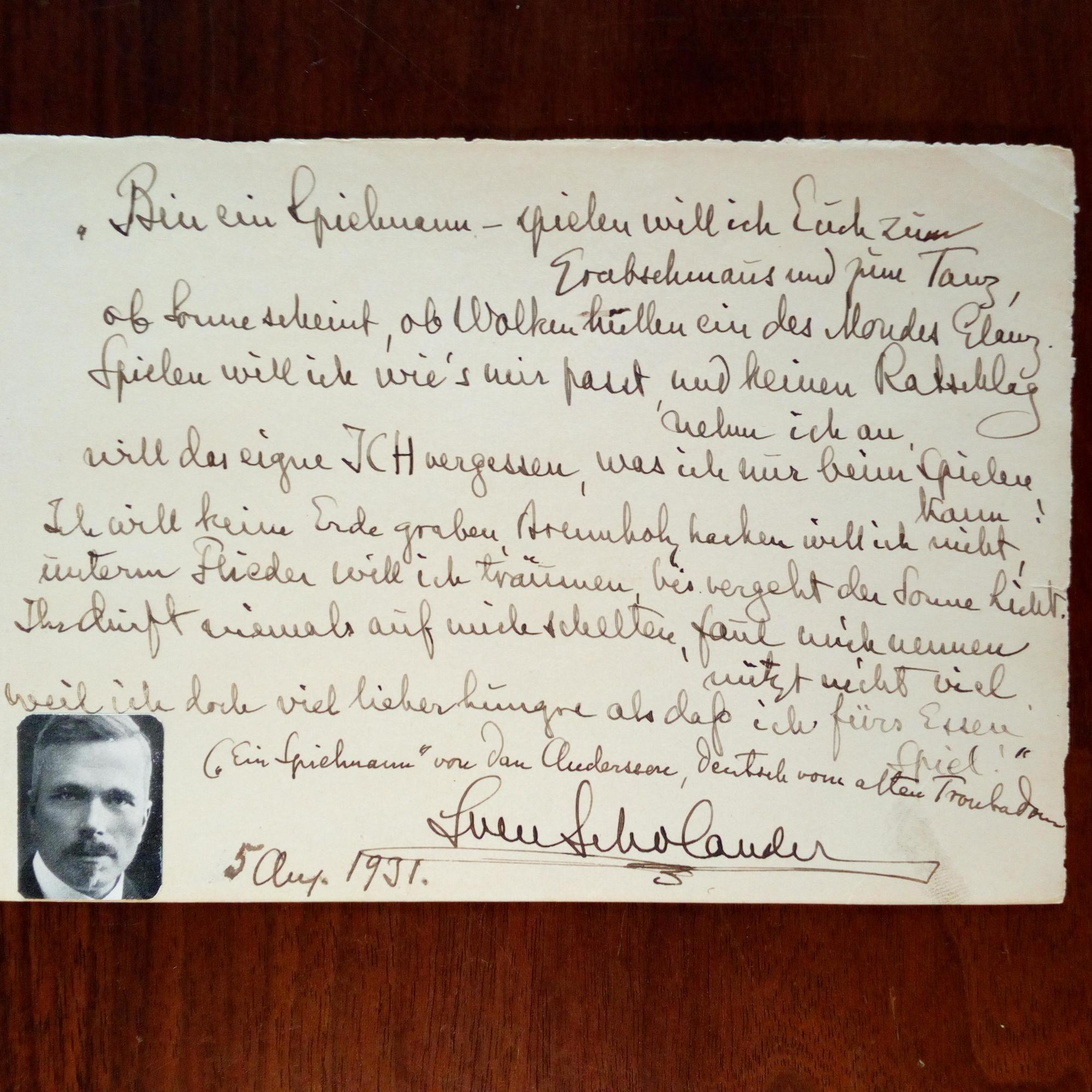 1860-1936, schwed. Folklore-Sänger und -Komponist, Lautenspieler und Fotograf - 8°quer-Blatt mit mont. kl. Druck-Pfo., e. Zitat (ca. 10 Z.), U. und D. 5.8.1931. "Bin ein Spielmann - spielen will ich Euch zum Grabschmaus und zum Tanz... (aus "Ein Spielmann" des schwed. Dichters Dan Andersson) deutsch vom alten Troubadour...