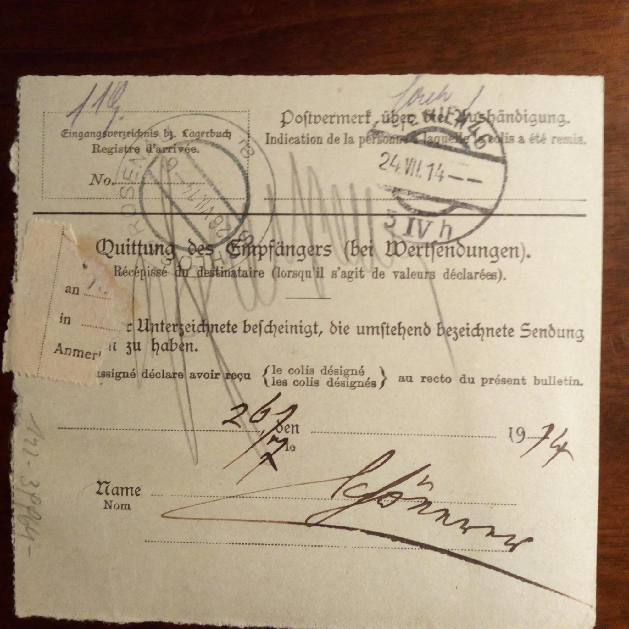 1842-1921, österr. deutschnat. Politiker - Nach-nahmeschein für eine Paketsendung m. U. u. D. (Wien 26.7.1914).