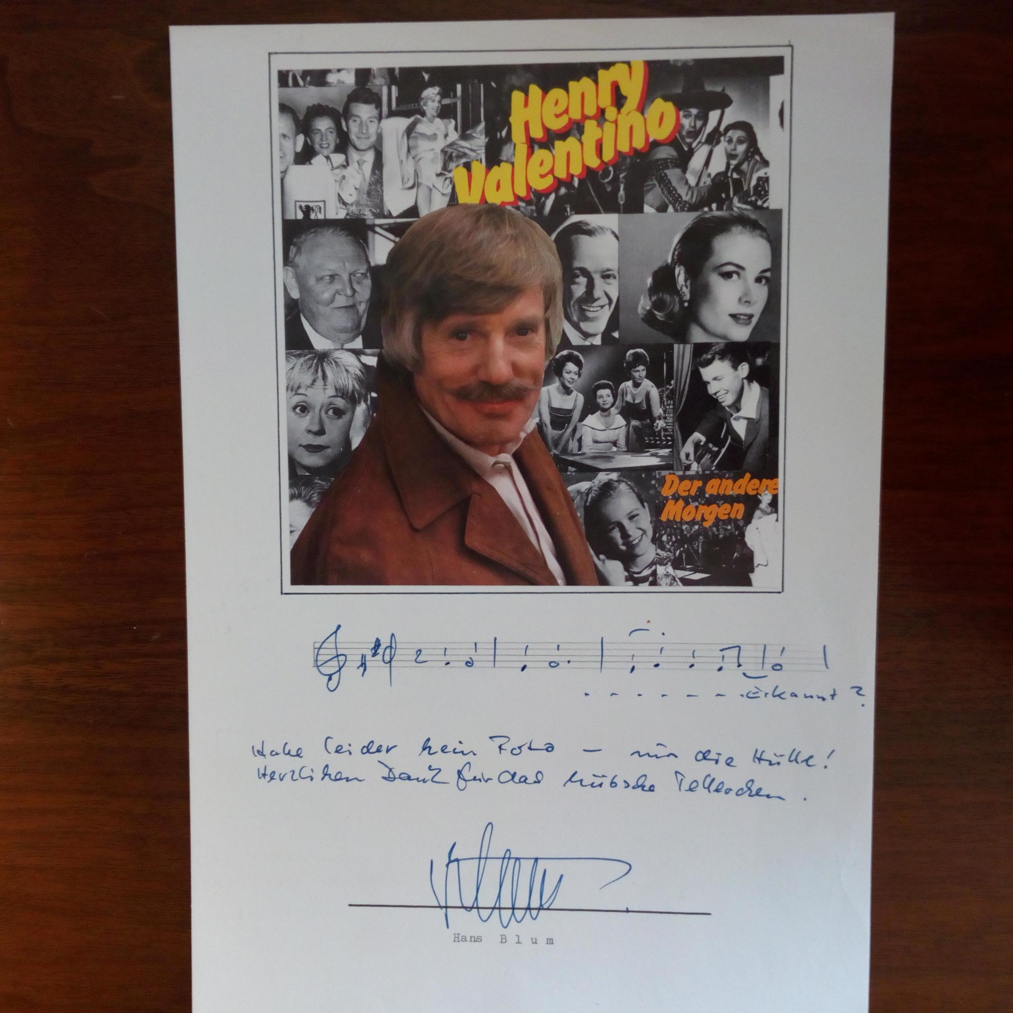 1928-2024, Schlagerkomponist, unter dem Pseudonym Henry Valentino auch -sänger - 4°-Blatt mit mont. Deckblatt der CD "Der andere Morgen" (1979), e. Notenzeile (4 Takte), e. Zeilen und U.