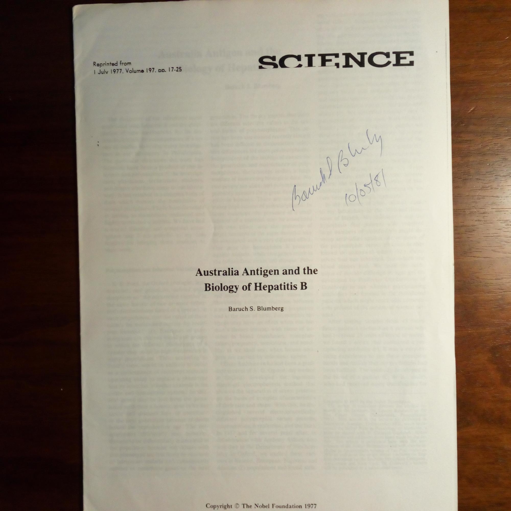 1925-2011, US-Mediziner - Reprint seines Aufsatzes "Australia Antigen and the Biology of Hepatitis B" aus der Zeitschrift "Science" vom 1.7.1977 m. U. u. D. 10.5.1978 auf Titel.