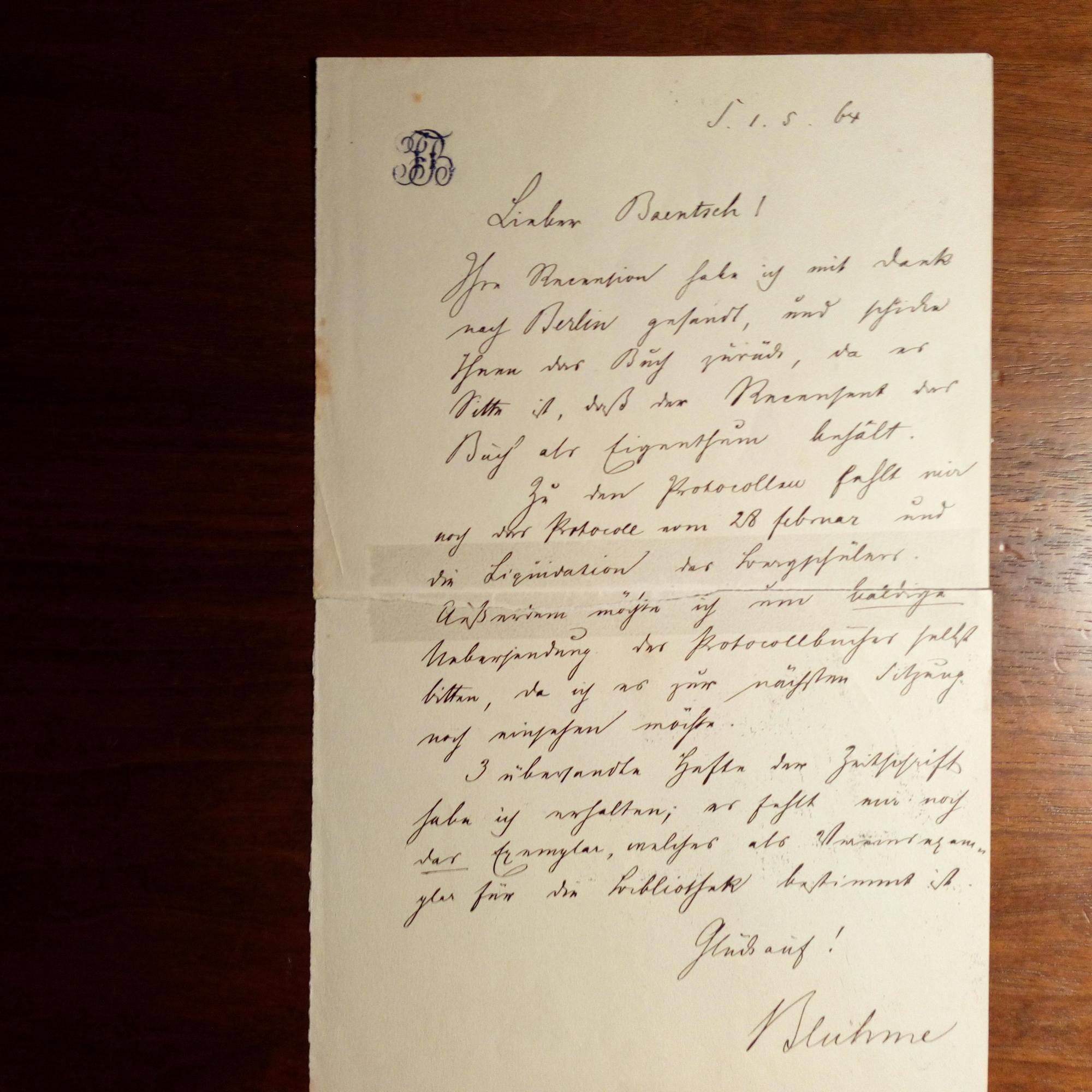 1797-1874, Jurist und Rechtshistoriker - E. Br. m. U., 1.5.1864, 1 S. 8°, gepr. Initialen am Kopf, Faltriss hinterlegt, etw. fleckig. An Baentsch betr. Versendung einer Rezension, Gerichts-Protokollen und Ausgaben von Zeitschriften "für die Bibliothek".