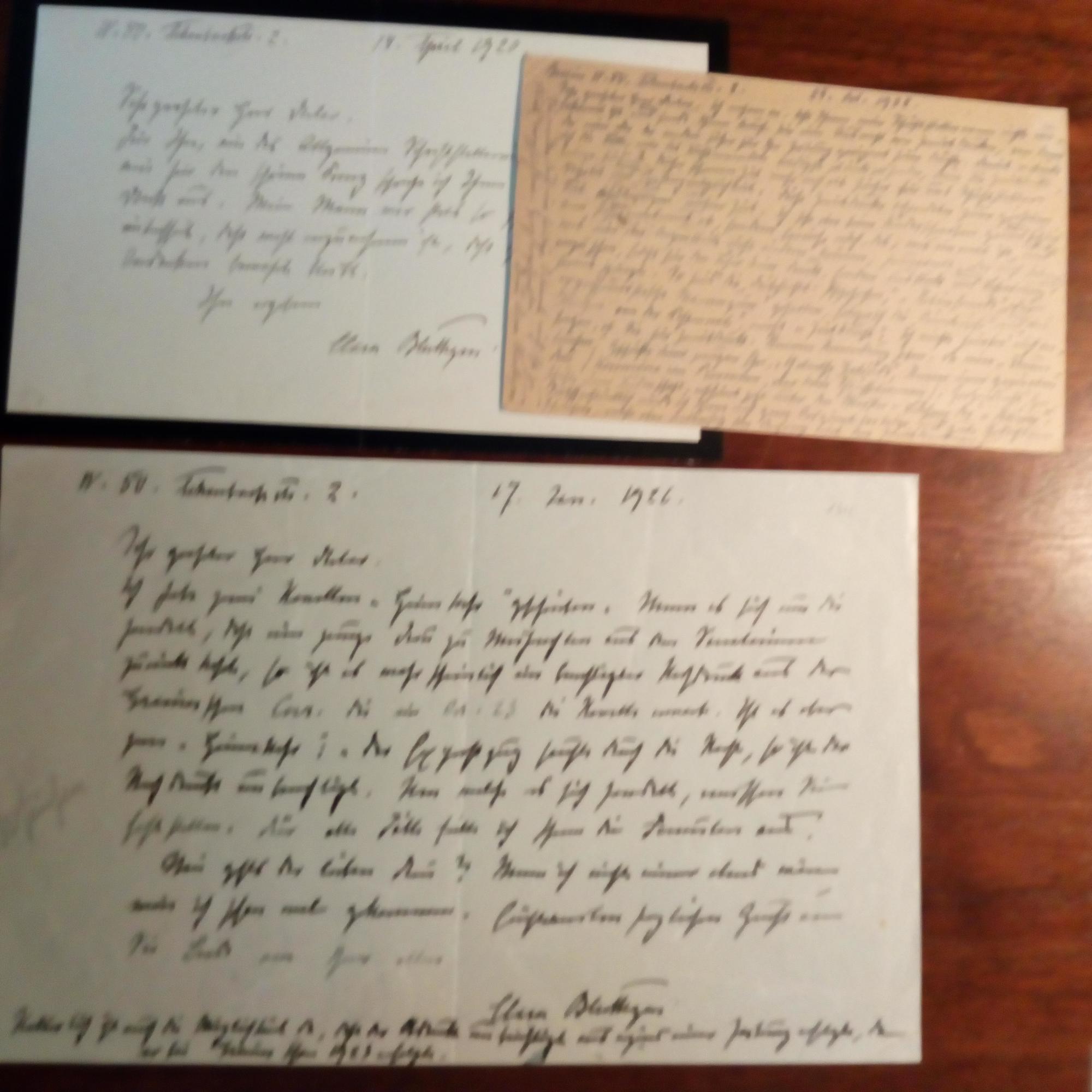 1856-1934, Schriftstellerin - E. Brief mit U., Berlin 14.4.1920, 1 S. 8°quer, schw. Rand. Dankt dem Allg. Schriftstellerverein für Teilnahme an der Beerdigung ihres Mannes, des Schriftstellers Victor B. Beiliegen: 2 e. Briefe mit U., 1925 und 1926, zus. 2 ½ S. gr.8° quer, mit Details zu Veröffentlichungen, mit Bearb.notizen des Adr., und: 2 e postal. Postkarten (eine davon Pfo.-Ansichtsk.) mit U., eine in Stenographie.