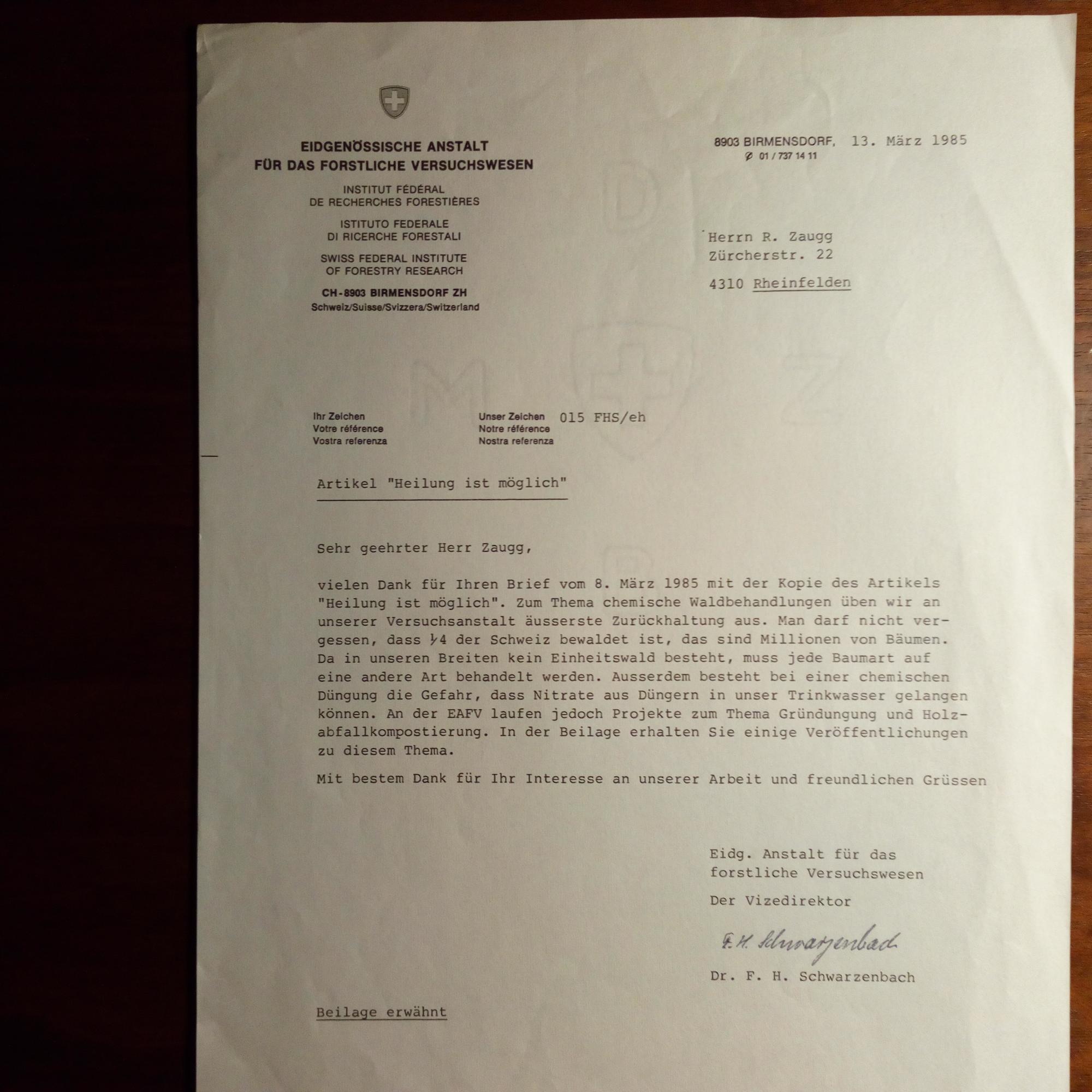1926-2018, schweiz. Alpinist und Botaniker - Brief mit U., (Birmensdorf) 13.3.1985, 1 S. 4°, Br.kopf der "Eidgenössischen Anstalt für das forstliche Versuchswesen". Dankt R. Zaugg in Rheinfelden für den Artikel "Heilung ist möglich": ...Zum Thema chemische Waldbehandlungen üben wir ... äusserste Zurückhaltung aus ... dass ¼ der Schweiz bewaldet ist, das sind Millionen von Bäumen...