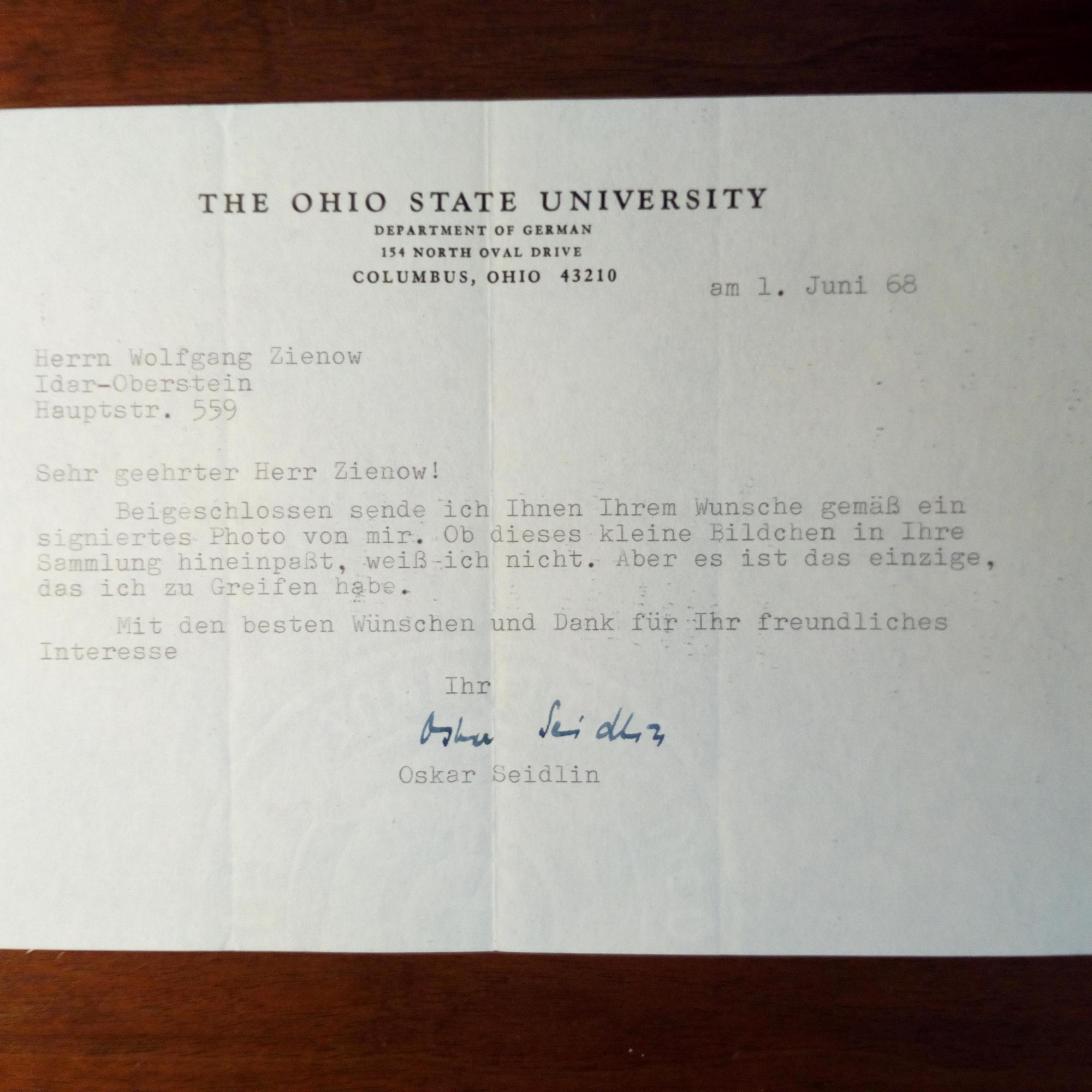 1911-76, dt. Germanist in USA - Pfo. (Passgröße) mit U., auf Rückseite weiterer Gruß mit U.. Dazu Begleitbrief mit U., Columbus/Ohio 1.6.1968, 1 S. 8°quer, Briefkopf der Universität, gel.