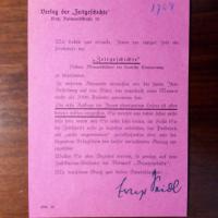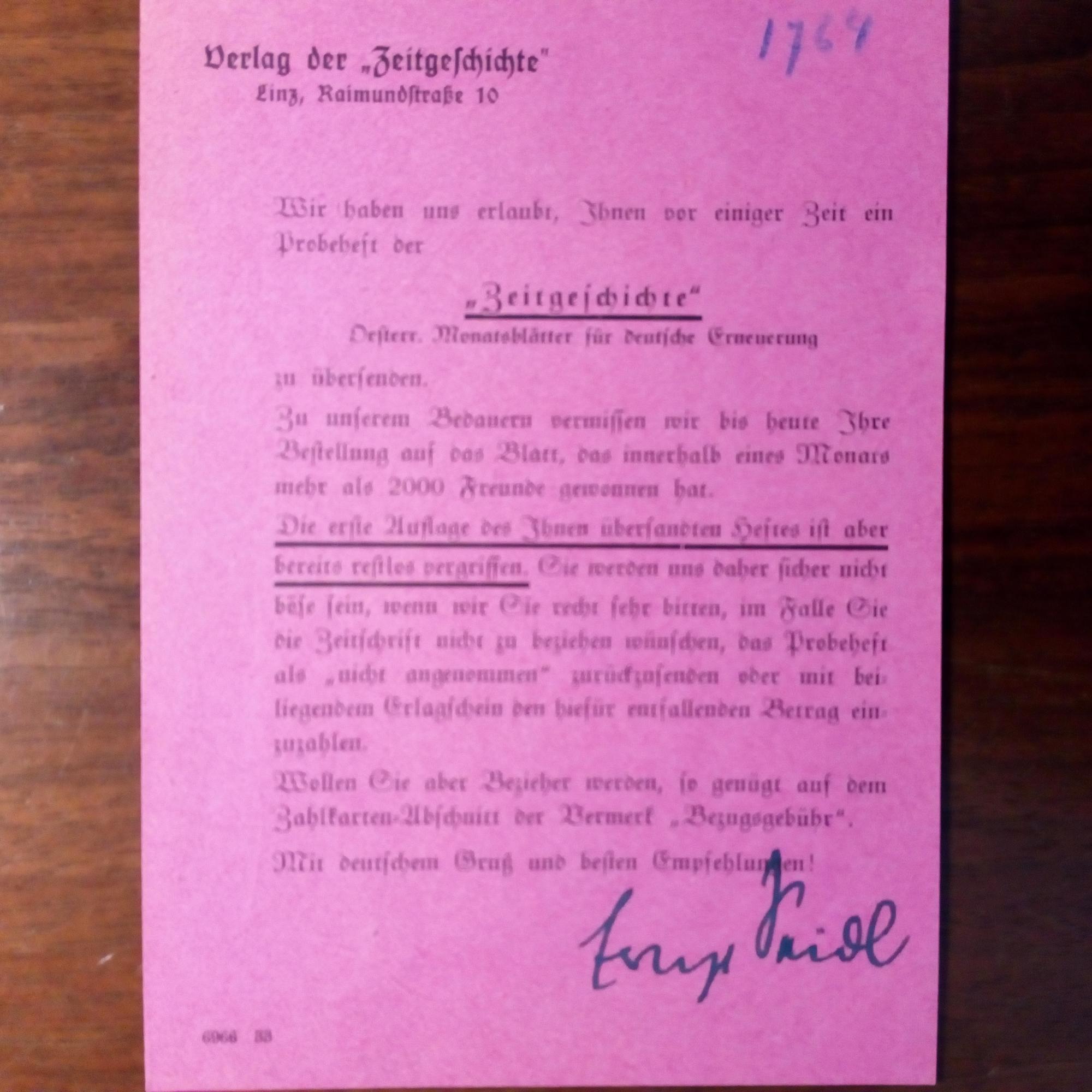 1905-87, österr. Journalist, Verleger - Kl. rotes Druckblatt mit U., Br.kopf des Verl. der "Zeitgeschichte" ("österr. Monatsblätter der dt. Erneuerung"). ...im Falle Sie die Zeitschrift nicht zu beziehen wünschen, das "Probeheft" als "nicht angenommen" zurückzusenden... dazu gr. Faltblatt (2 S. folio). "Bestellzettel zum Börsenblatt für den Dt. Buchhandel", 8.3.1940.