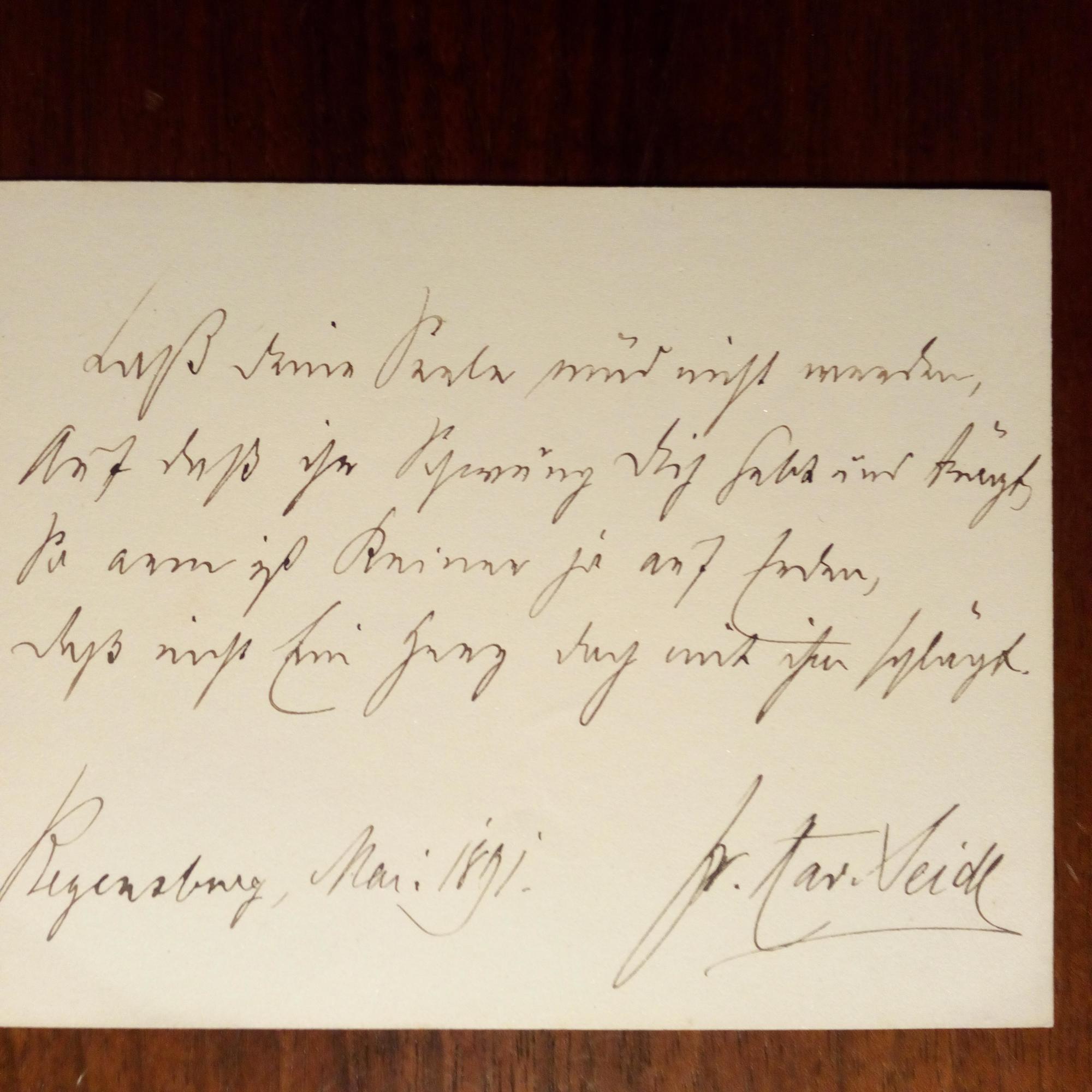 1845-92, Literaturhistoriker und Schriftsteller - Kärtchen mit e. Zitat und U., Regensburg Mai 1891. "Laß Deine Seele müd nicht werden,/ Auf dass ihr Schwung Dich hebt und trägt,/ So arm ist keiner je auf Erden,/ Dass nicht Ein Herz doch mit ihm schlägt.".