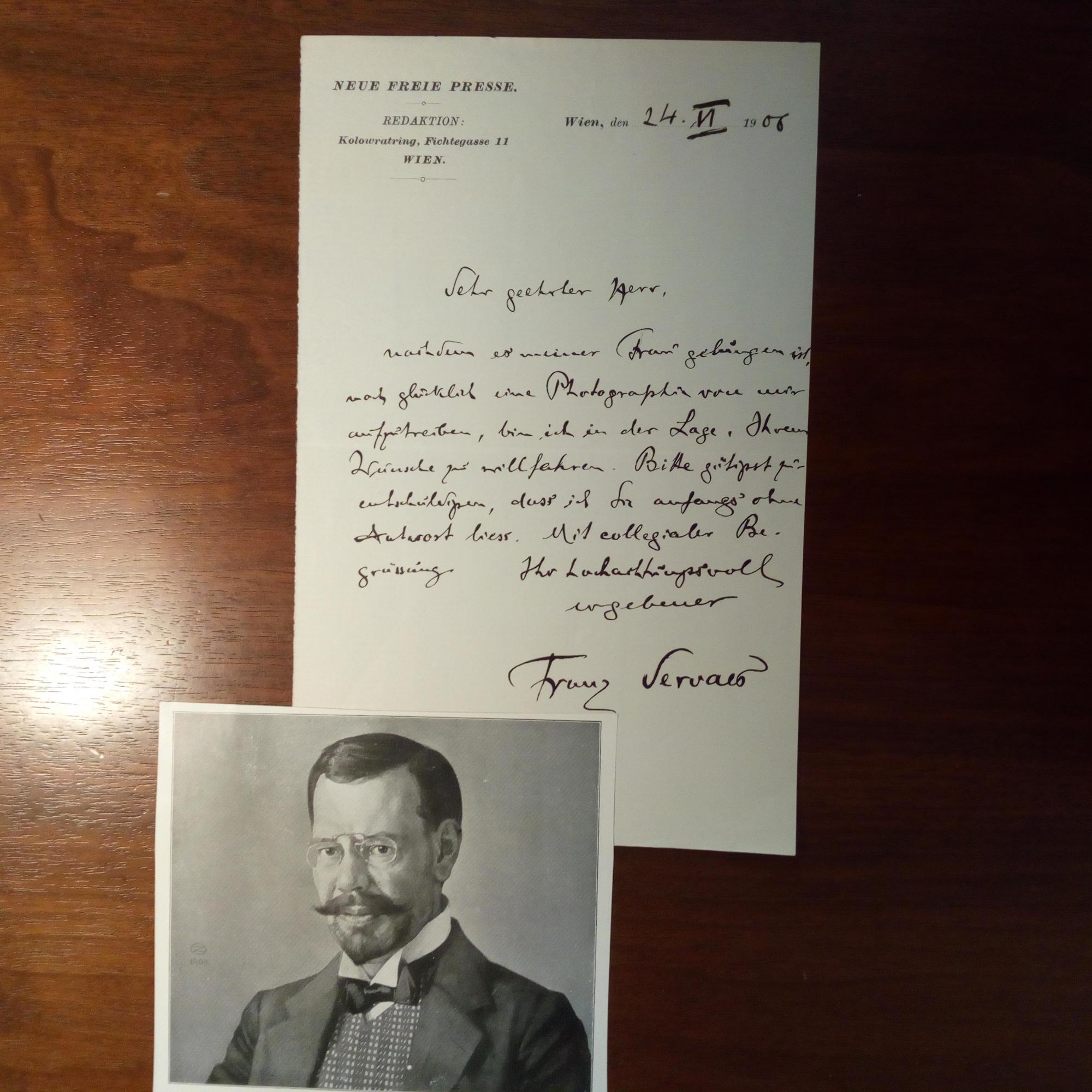 1862-1947, Kritiker und Schriftsteller - 1. E. Brief mit U., 11.11.1893, 1 S. kl. 8°, Abs.stempel. An den "Director des 'Deutschen Volkstheaters'" (Emerich von Bukovich). Bittet um einen Termin, ihm sein neues Drama vorzustellen. 2. Kl. 4°-Blatt mit e. Aphorismus ("Als Reichsdeutscher fühle ich mich durch die Erscheinung Franz Josephs I. immer an die Gestalt unseres geliebten alten Kaisers Wilhelm I. erinnert..."). Mit e. Begleitbrief mit U., (Wien) 9.8.1908, ¾ S. 8°, Briefkopf der "Neuen freien Presse". 3. E. Brief mit U., (Wien) 24.6.1906, 1 S. gr. 8°, Briefkopf wie vor. Sendet eine Fotografie von sich. Beiliegt Porträt (nach Gemälde, aus Zeitschrift).