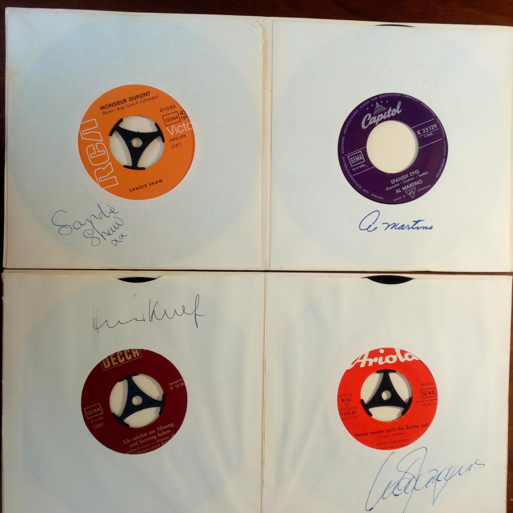 Schuber "Melodien vom Graetz-Sommernachtsball 1967". Darin 2 Single-Schallplatten, je mit U. auf der Innenhülle, von Sandie Shaw "Monsieur Dupont" und Al Martino "Spanish Eyes" (Sekretärs-U.). Beiliegt aus ders. Edition: Hildegard Knef "Ich möchte am Montag mal Sonntag haben" und Udo Jürgens "Immer wieder geht die Sonne auf".