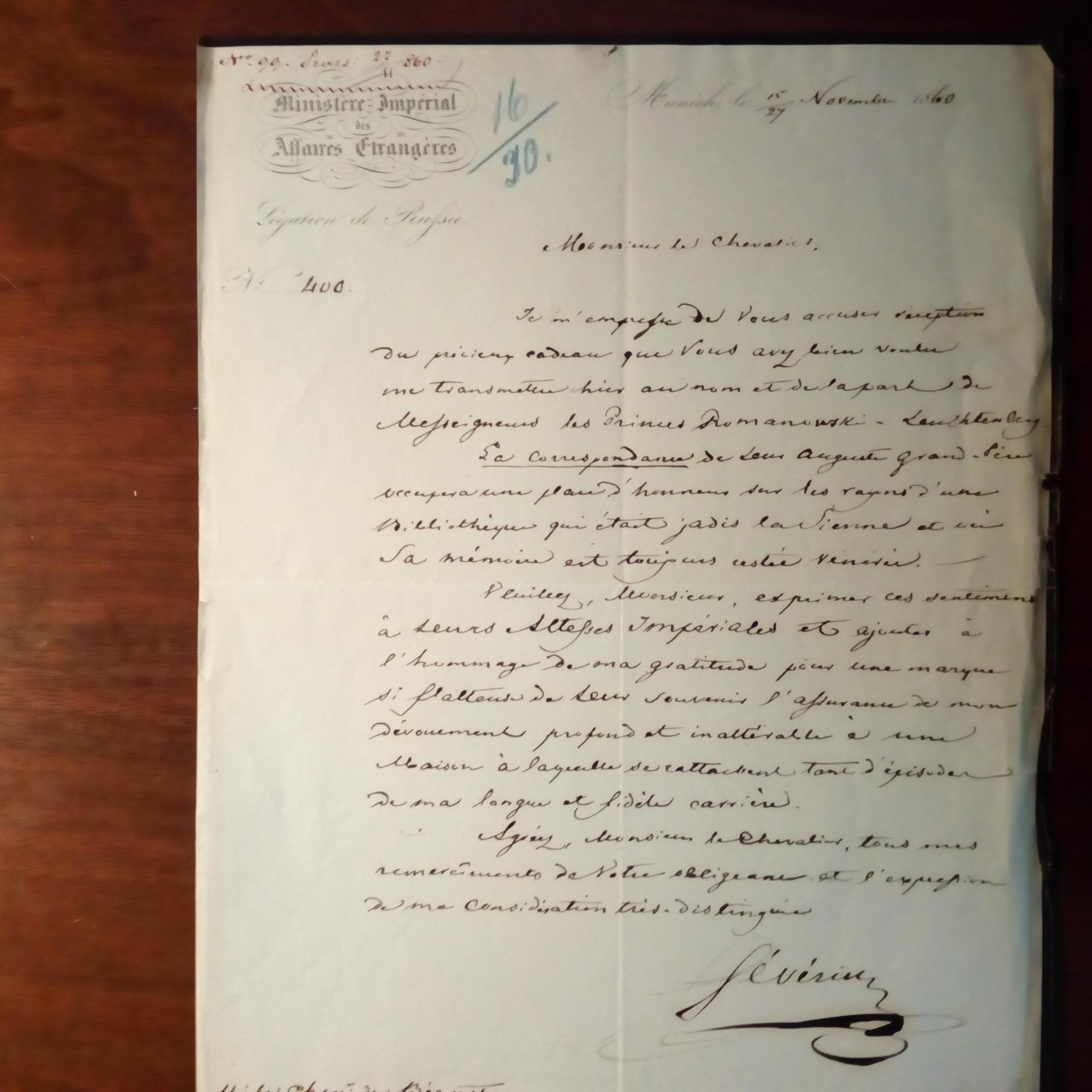 1791-1865, russ. Diplomat - E. Brief mit U., (München) 27.11.1860, 1 S. folio, schwarzer Rand, etw. beschädigt. An den Chevalier de Bérusseau in München. Ein "précieux cadeau" aus dem Besitz des Prinzen von Romanowski-Leuchtenberg, das dieser ihm gestern geschickt habe, solle in eine passende Bibliothek überführt werden. Richtet ausführl. Grüße an das bayerische Königspaar aus.