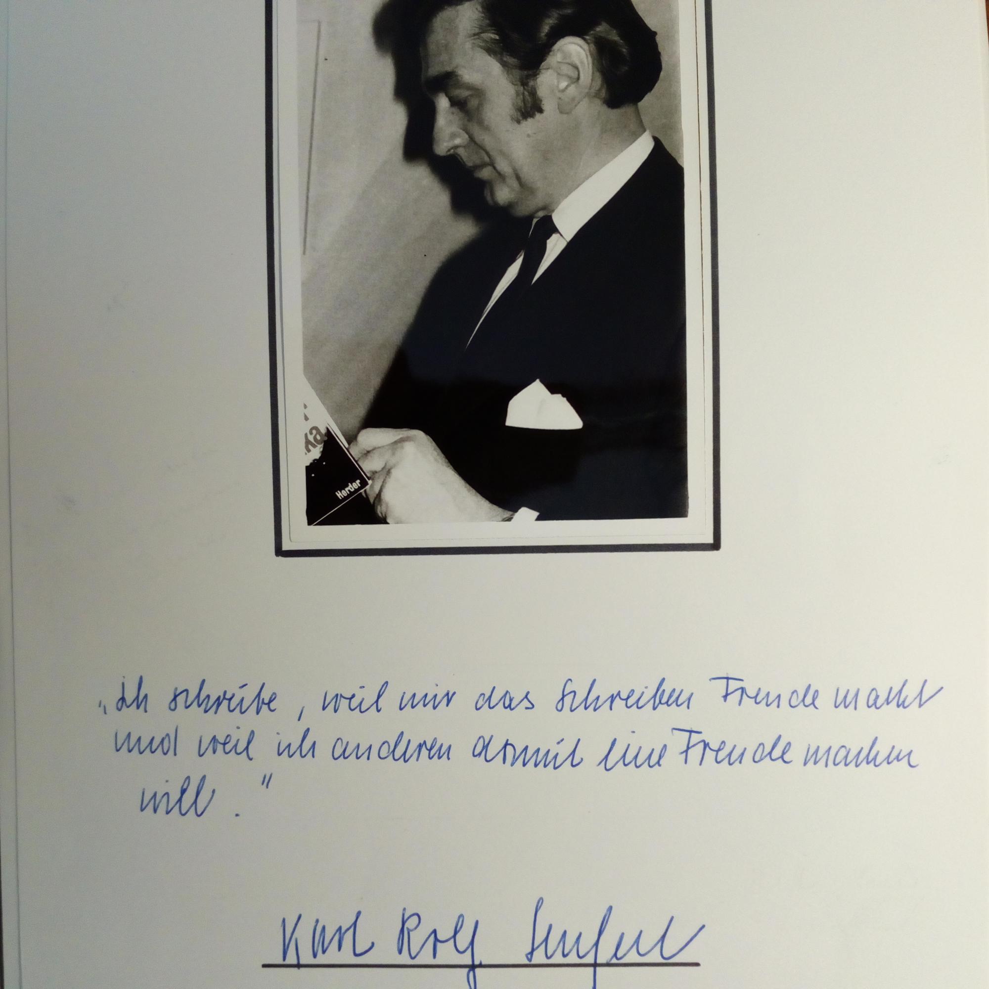 1923-92, histor. Schriftst. - Schönes 4°-Blatt m. e. Zitat u. U. unter Hochglanz-Pfo. (beim Signieren). "Ich schreibe, weil...".