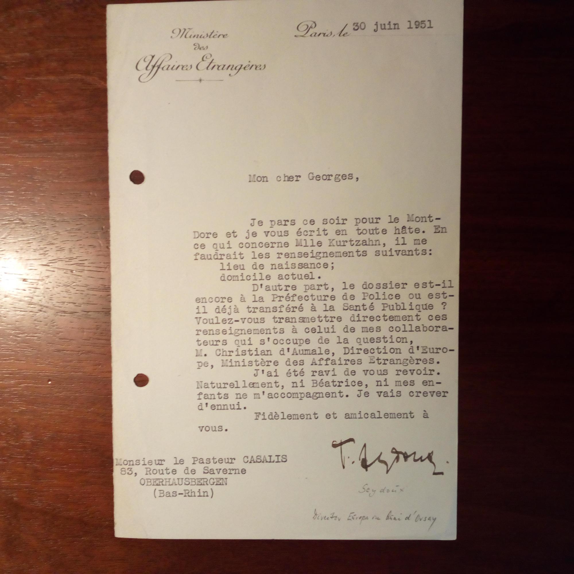 1905-81, frz. Diplomat - Brief mit U., (Paris) 30.6.1951, 1 S. 8°, Briefkopf des Außenministeriums. Freundschaftlich an den frz. evangel. Pastor George Casalis (1917-87, Mitgl. der Résistance, dann Befreiungstheologe) bei Straßburg: ...le dossier est-il encore à la Préfecture de Police ou est-il déjà transféré à la Santé Publique...fidèlement et amicalement... Erwähnt Mlle Kurtzahn und den Diplomaten Christian d'Aumale.