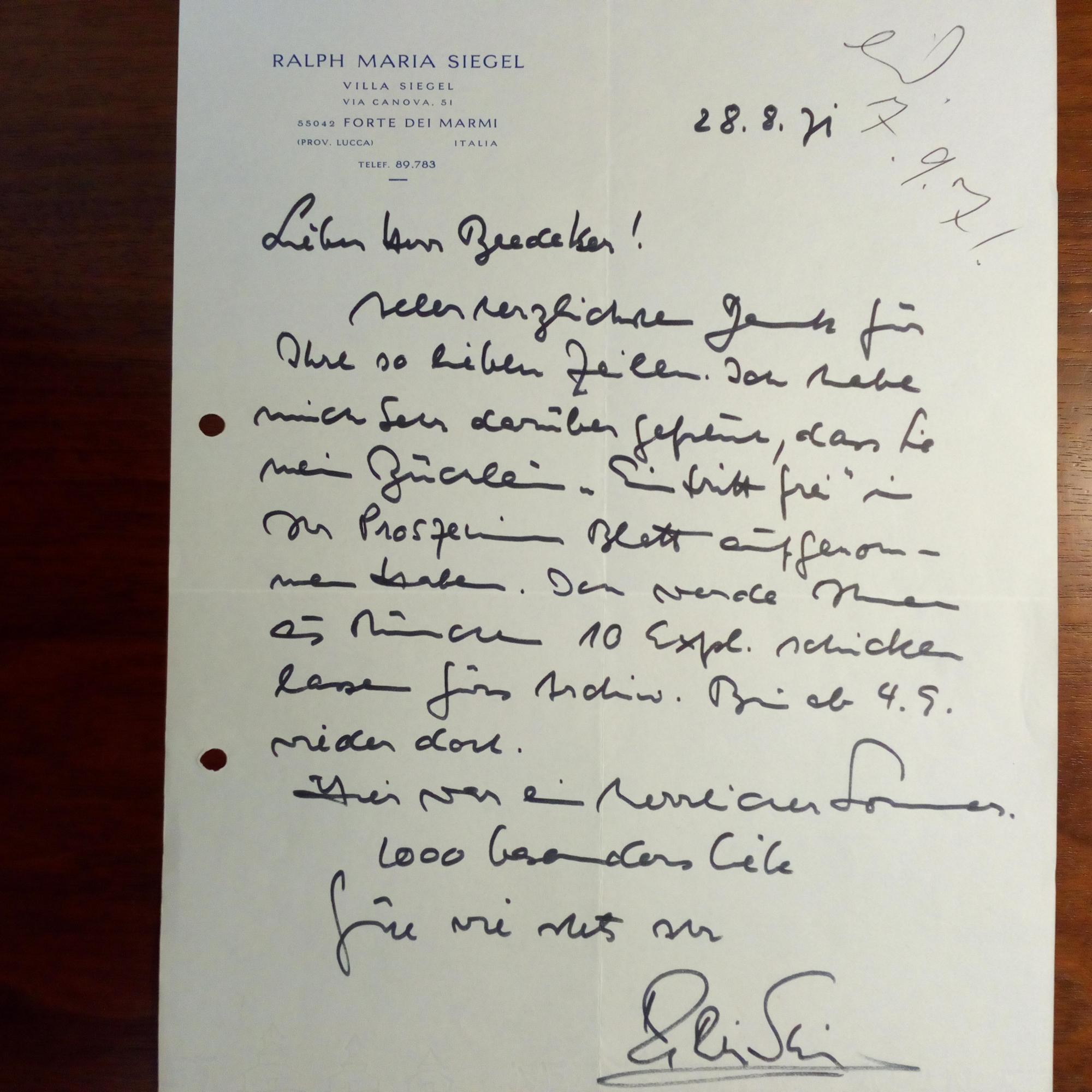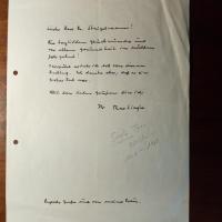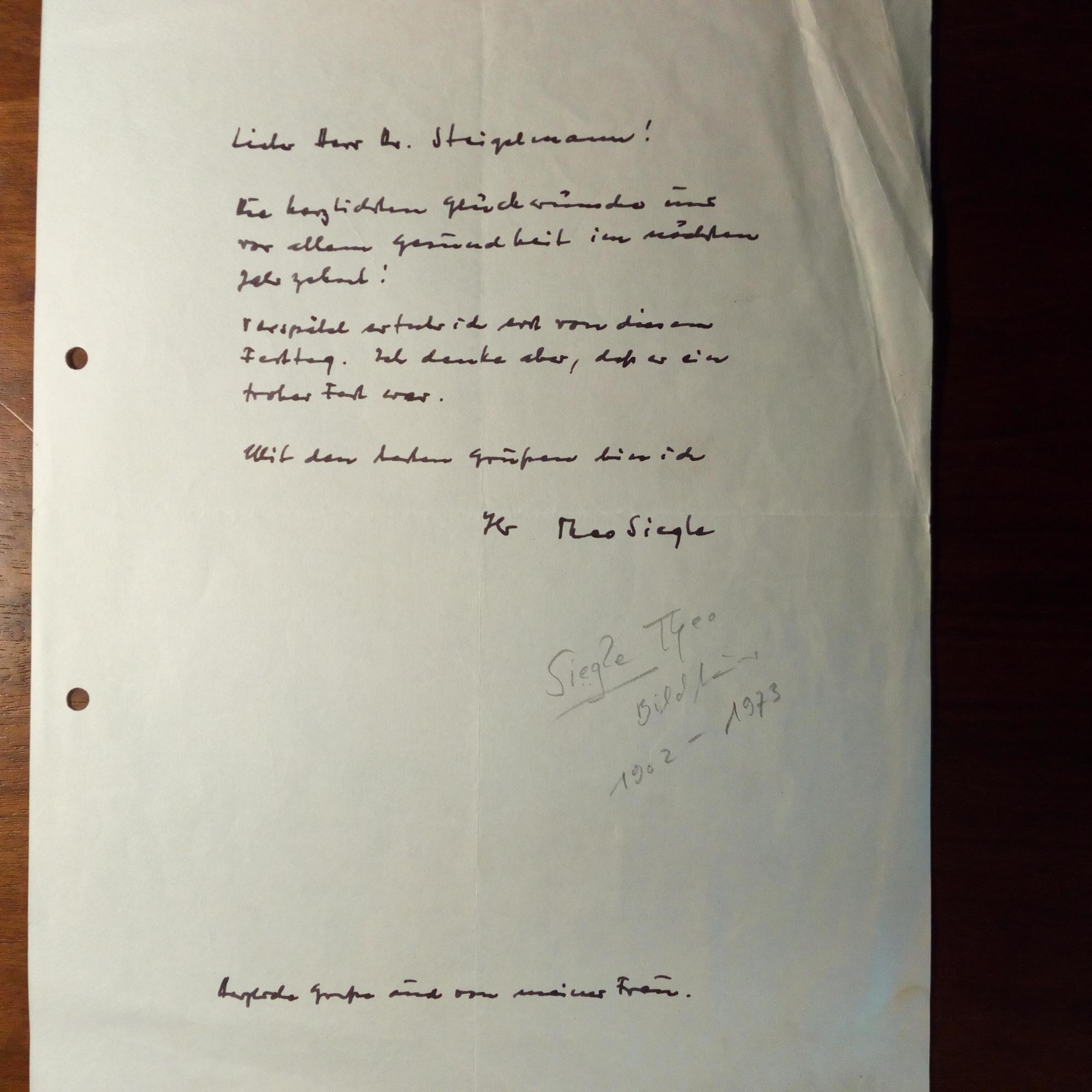 1911-98, Rechtswiss. (Versicherungsrecht) - 29 Briefe mit U., zus. ca. 40 S. 4°, meist dicht geschr., mit e. Zusätzen, auch von seiner Frau, mit Br.kopf (Berlin, ab 1974 Hamburg) 1964-1982, und 20 e. Briefkarten mit U., meist postal. oder mit e. postal. Umschlägen. An den Ratsherrn in Hannover Eberhard Schako und dessen Gattin: Betr. Bekannter (erw. "die alten Köpenicker"), gegenseitiger Treffen, Lebenssituation, Vorträgen und Veröffentlichungen sowie Geb.wünsche, Urlaubs-Grüße u.ä.
