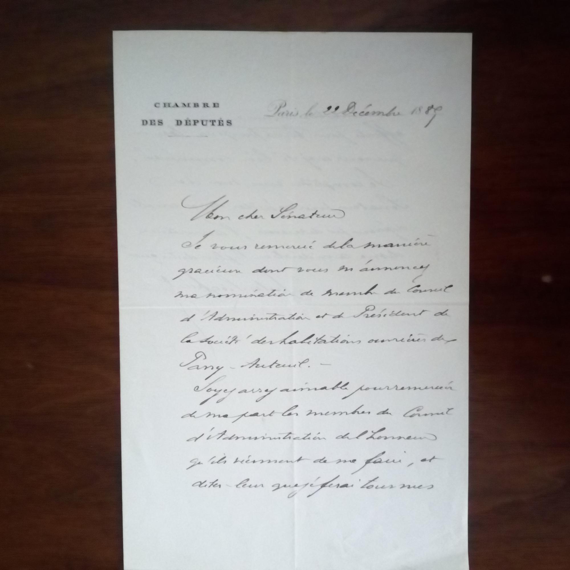 1837-1922, frz. Politiker - E. Brief mit U., (Paris) 22.12.1889, 1 ½ S. 8°. Dankt einem Senator ausführl. für Glückwünsche zu seiner Ernennung zum "membre du Conseil d'Administration".