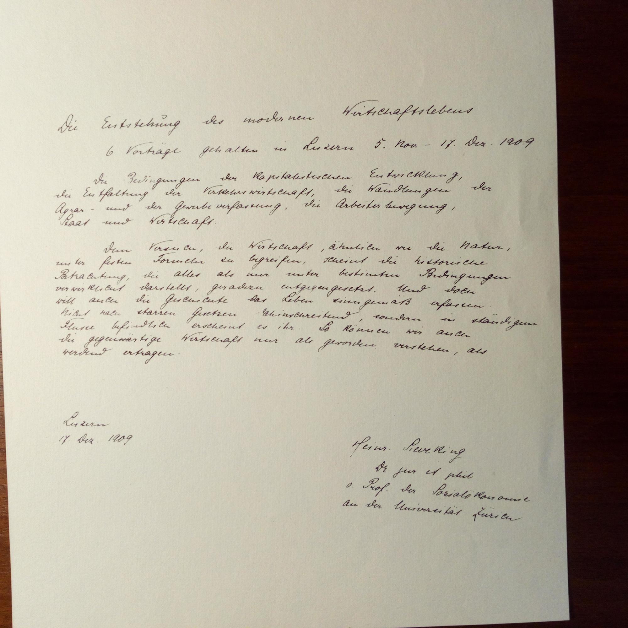 1871-1945, Ökonom und Historiker - 4°-Blatt mit e. Ausführungen zu seiner Vortragsreihe "Die Entstehung des modernen Wirtschaftslebens" mit U., Luzern 17.12.1909, sehr kl. Schrift.