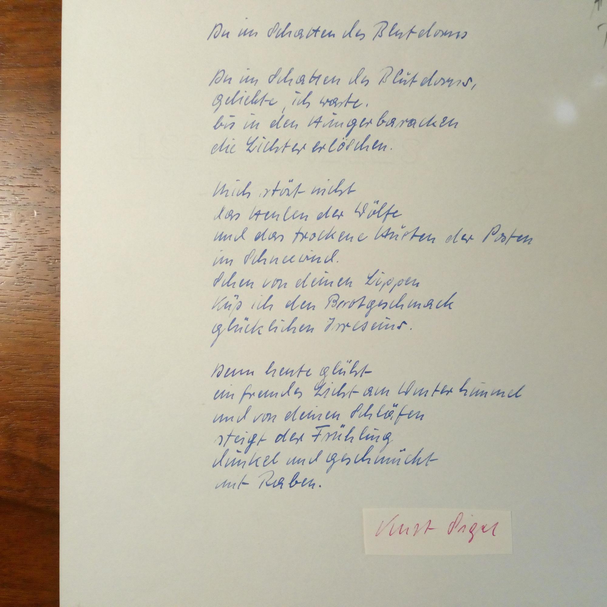 1931-2022, Schriftsteller und Künstler - 2 Blätter mit e. Gedichten ("Schreckliche Zeit", 3 Str. à 5 Z., und "Du im Schatten des Blutdorns", 16 Z., letzteres mit mont. U.), je 1 S. 4°.